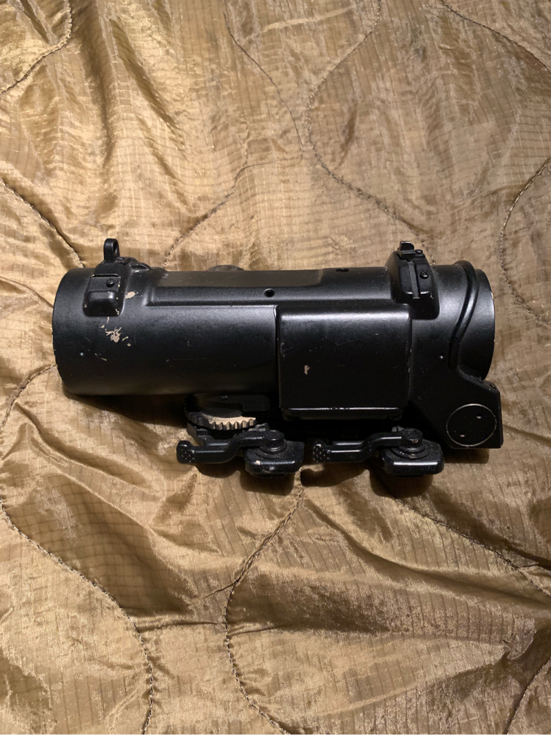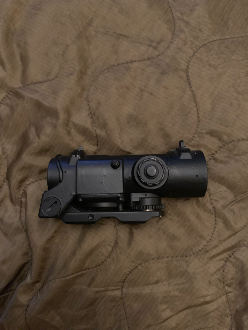Selling a repro elcan fixed 4x optic. Looks like it was originally tan, previous owner painted it black. 50 bucks shipped