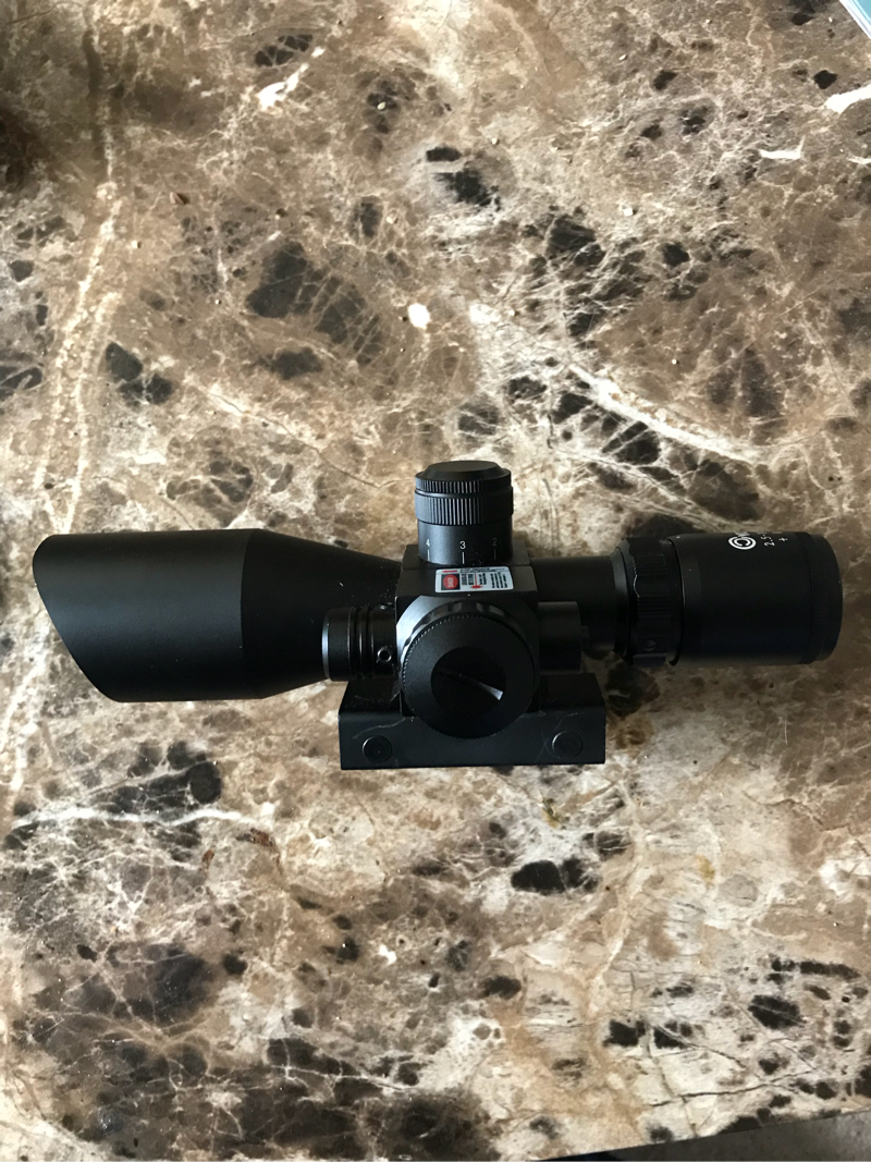 30 shipped. Has red & green illumination and a laser attached. I’ve never used the laser and never even put batteries in for the laser. Variable zoom, 2.5-10x
