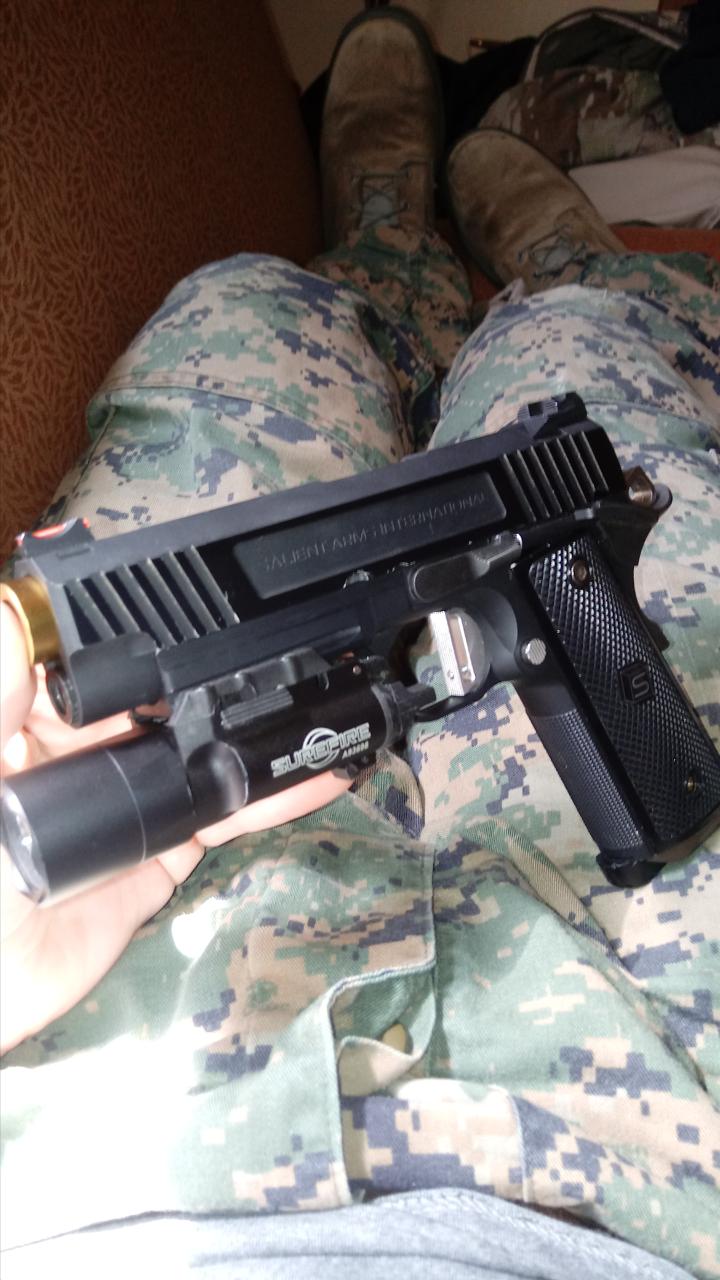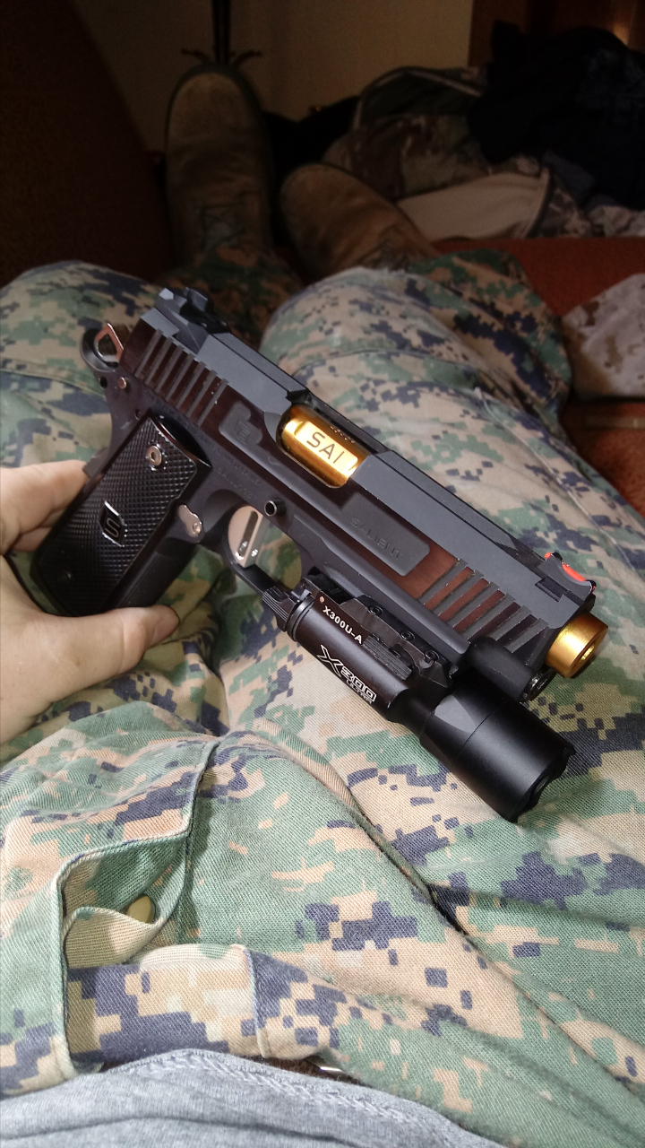 Looking to rehome this $1300 build. Consists of a 6063 aluminum Nova SAI body kit (frame, slide, sights, grips, guide rod and stainless barrel) with full steel Nova frame parts and stainless trigger, hammer and mag release. Slide has a Guarder nylon fiber nozzle in a Nova featherweight aluminum blowback housing. Inner barrel and hop assembly are stock TM, with Maple Leaf green bucking. Frame and slide have proper Salient Arms roller-stamped trades and barrel has lasered trades over a hard chromatic gold finish. Hit me up with offers.