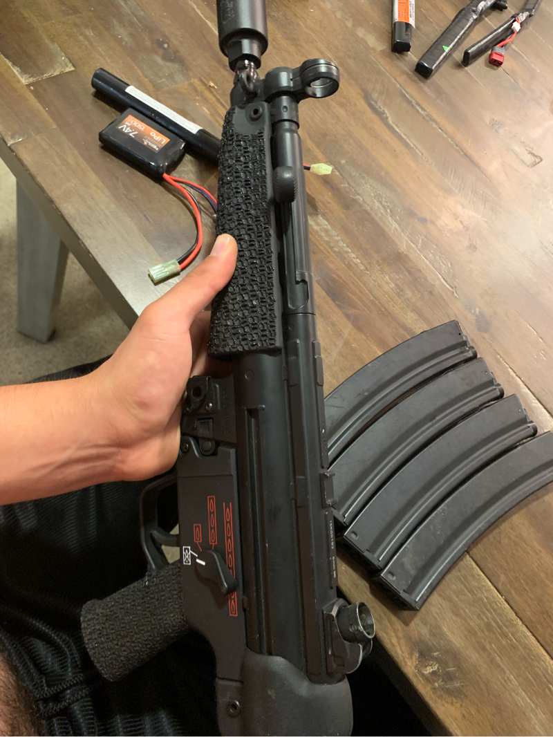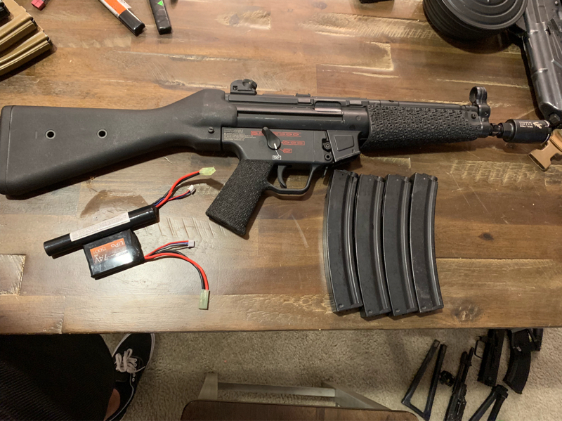 Semi new umarex “elite force” mp5 electric come with 4 hi caps 2 battery’s 7.4v 1500 mAh and a skull frog “suppressor” aka a noise maker had full auto, burst, semi works like a champ great deal I’m located in San Diego but prefer to keep it local that’s for looking 🙏🏽 also it have basket weave stippling 👀👀 hot boiii shidtt