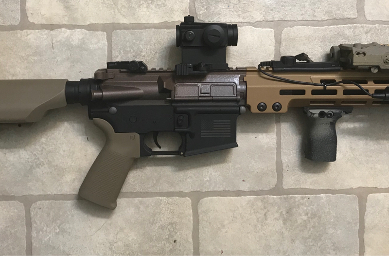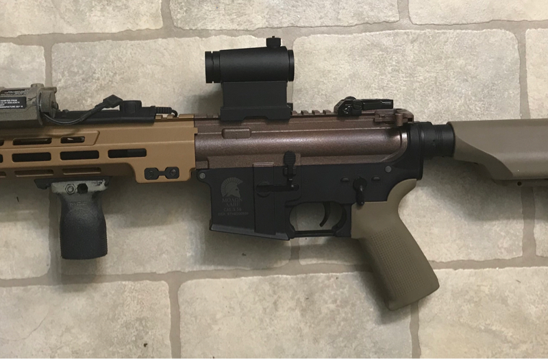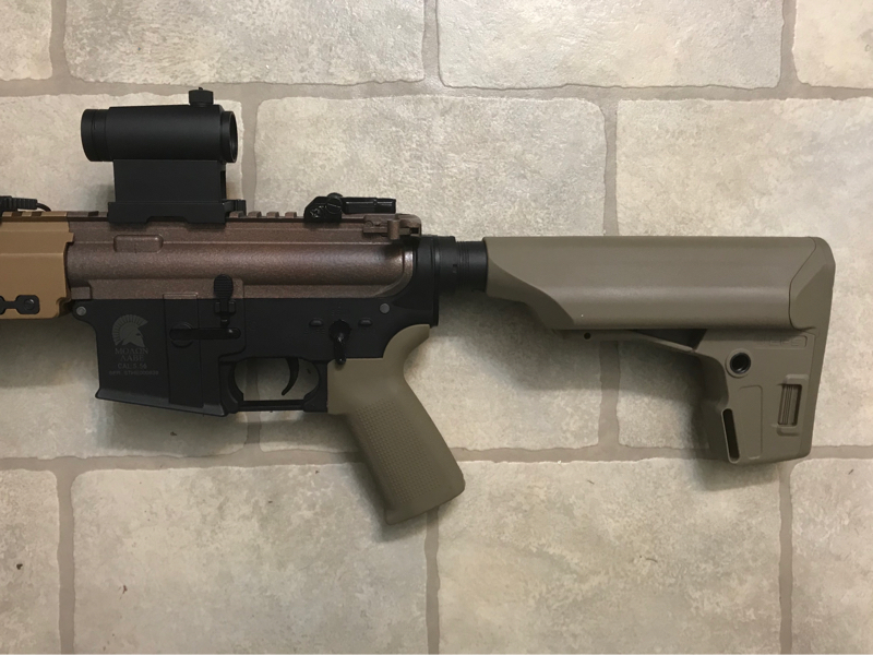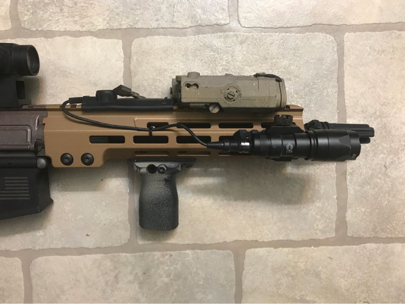 Base gun is a Matrix with upgraded V2 Lipo ready gearbox, microswitch trigger and quick change spring guide. Replica Geissele URGI rail, PTS stock and motor grip, Replica T1 sight, replica Surefire with pressure switch and PEQ with green laser and pressure switch and foregrip. Price is firm and includes shipping and fees.