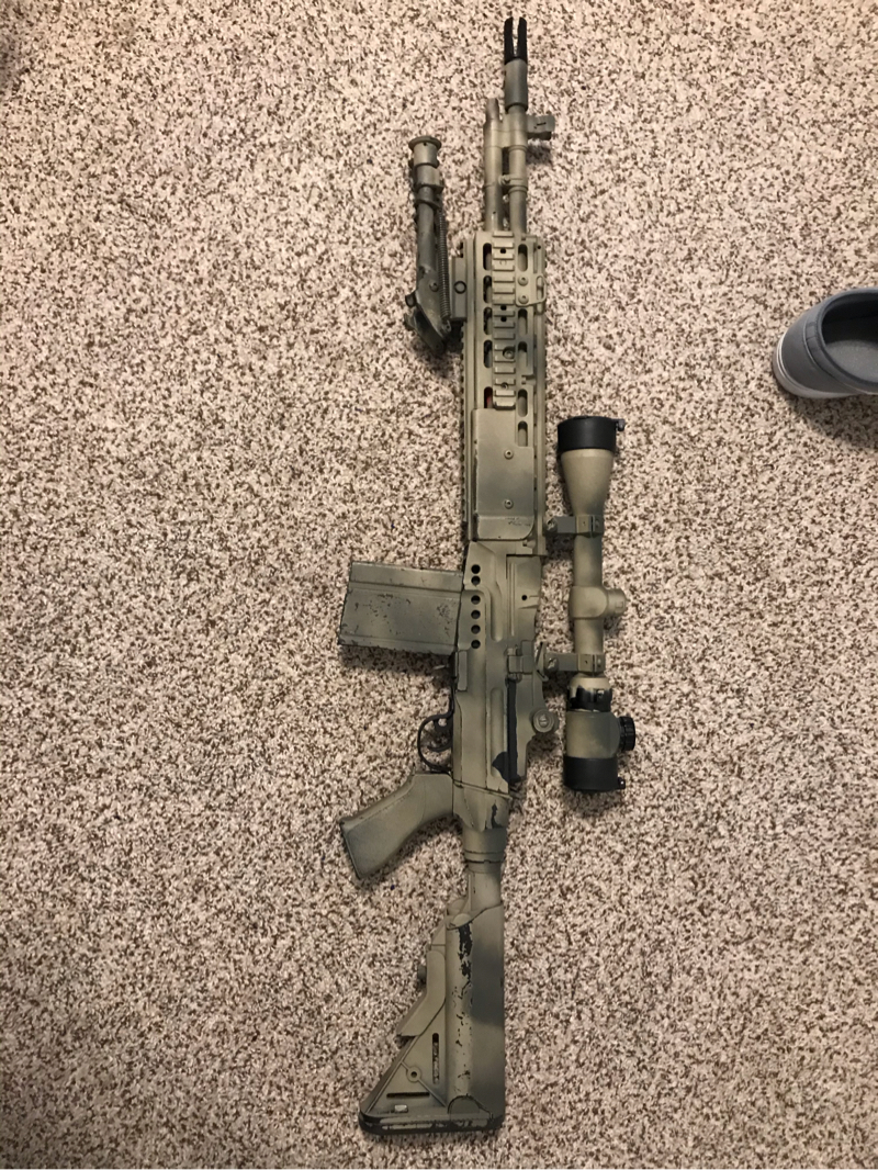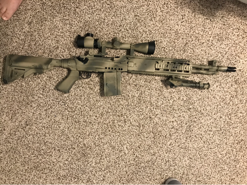 Selling my basically brand new cyma m14 ebr aeg. It has been painted and will come with 6 mags total 3 high cap (all black) and 3 mid cap (painted to match rifle). Only issue with gun is the charging handle does not move but this is not a necessary part for the function of the gun (hopup) is in mag well.