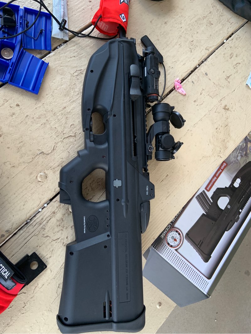 This is a G&G FN Herstal F2000. It comes with the battery, charger, and an extra mag, it comes with its original box. Will not come with peq box or scope