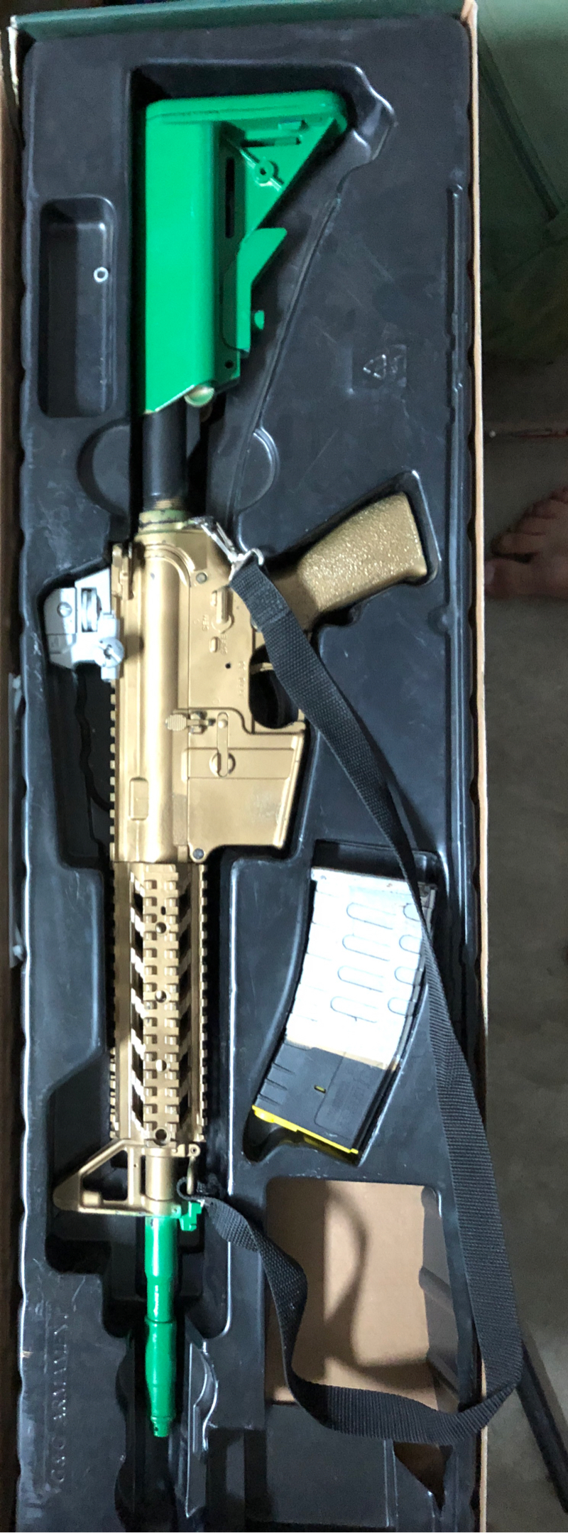Spray painted green and gold! Slightly modified internals: ARES cylinder and ARES spring. In good condition.