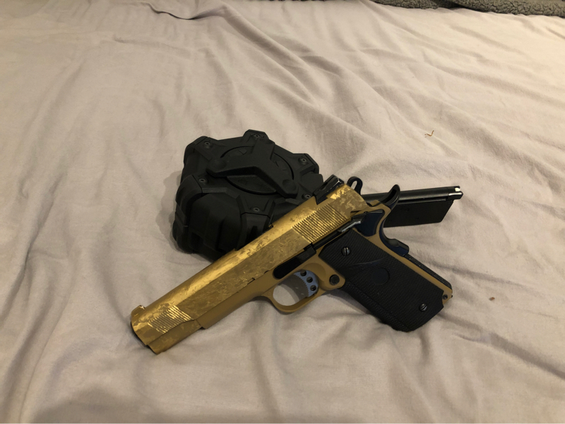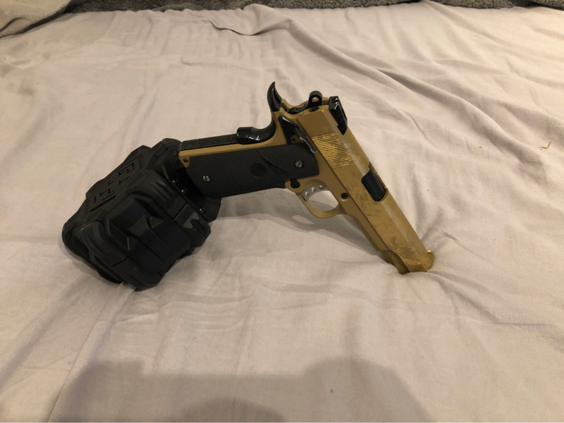 It’s an 1911 with a 400 round drum mag and an extra 20 bb magazine. It’s threaded barrel was sadly removed but still fires fine and works great indoor will. Send me offers if 120 is to high for you 👌