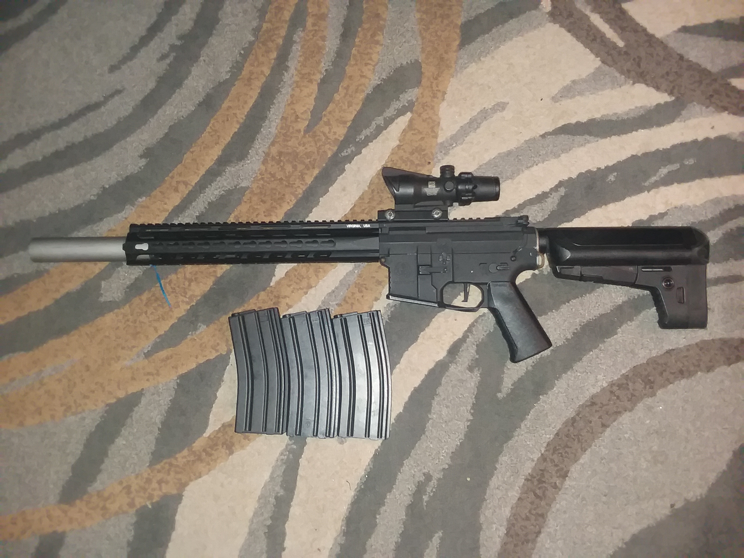 Minimal use very small scratches on body but paint is still mint, internals work amazing never had a problem.Everything in the pictures is included.(Gun,3 mid cap mags,Trijicon ACOG scope,silencer(choice of 1 in pic or black) battery and sling
