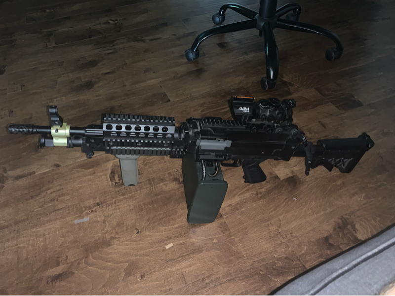 Alright I’m thinking of getting something new so I might be looking at selling my A&K mk46. I’ve fielded it twice at D14 and only for a few games each day. It would come with everything in the picture here except the forward grip. I’ve had no issues with the box mag it has 3 settings off, auto winding, and sound winding. It holds about 2500rds. At the chrono this past weekend it was at 436fps. Everything on it is stock. It will come with 2 Valken 1600mah batteries and charger for $300. No trades cash only no shipping.