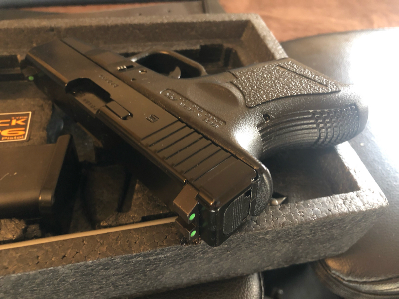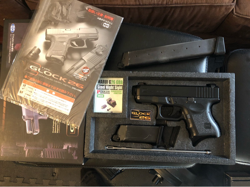 Comes with Guarder sights already installed, original sights, original magazine, extended Marui magazine, pinky baseplate for short magazine, original box, and manual.