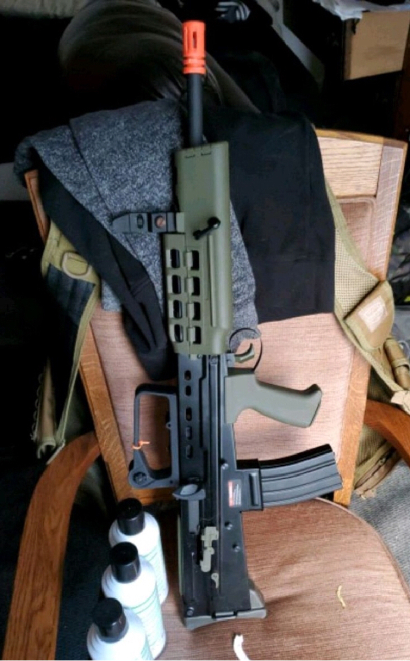 L85 has blowback airsoft rifle with magazine and 3 cans of green gas included