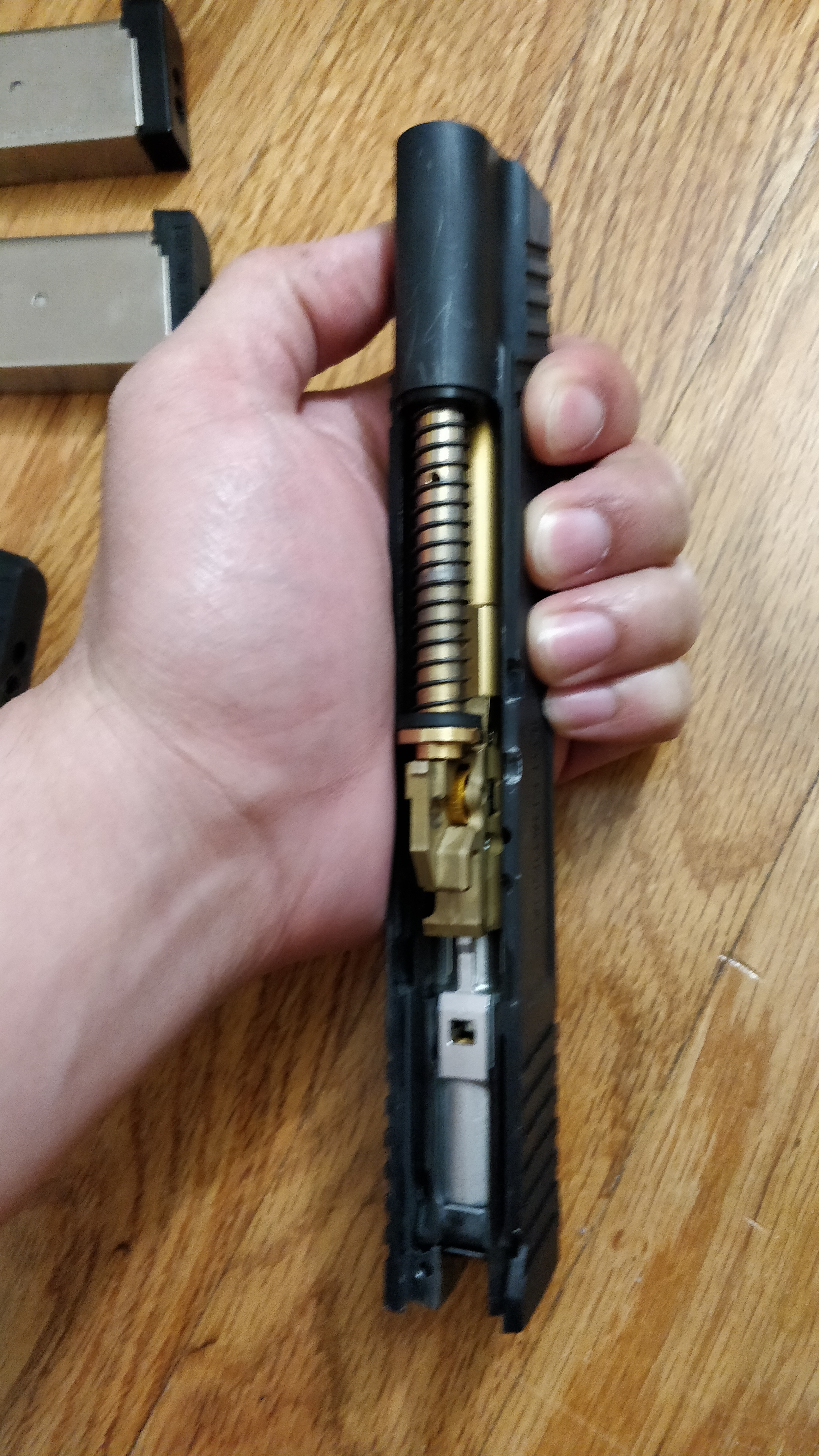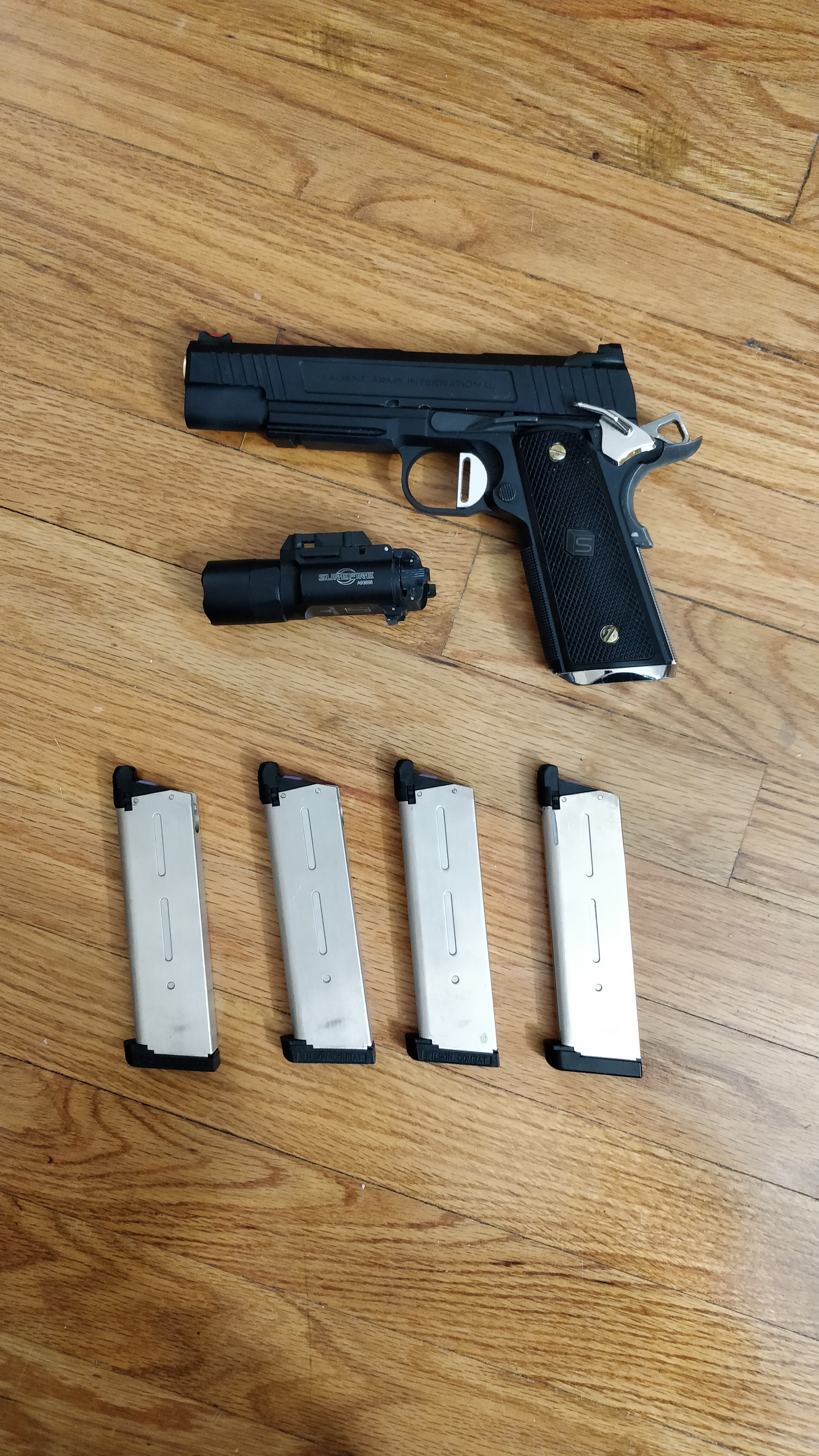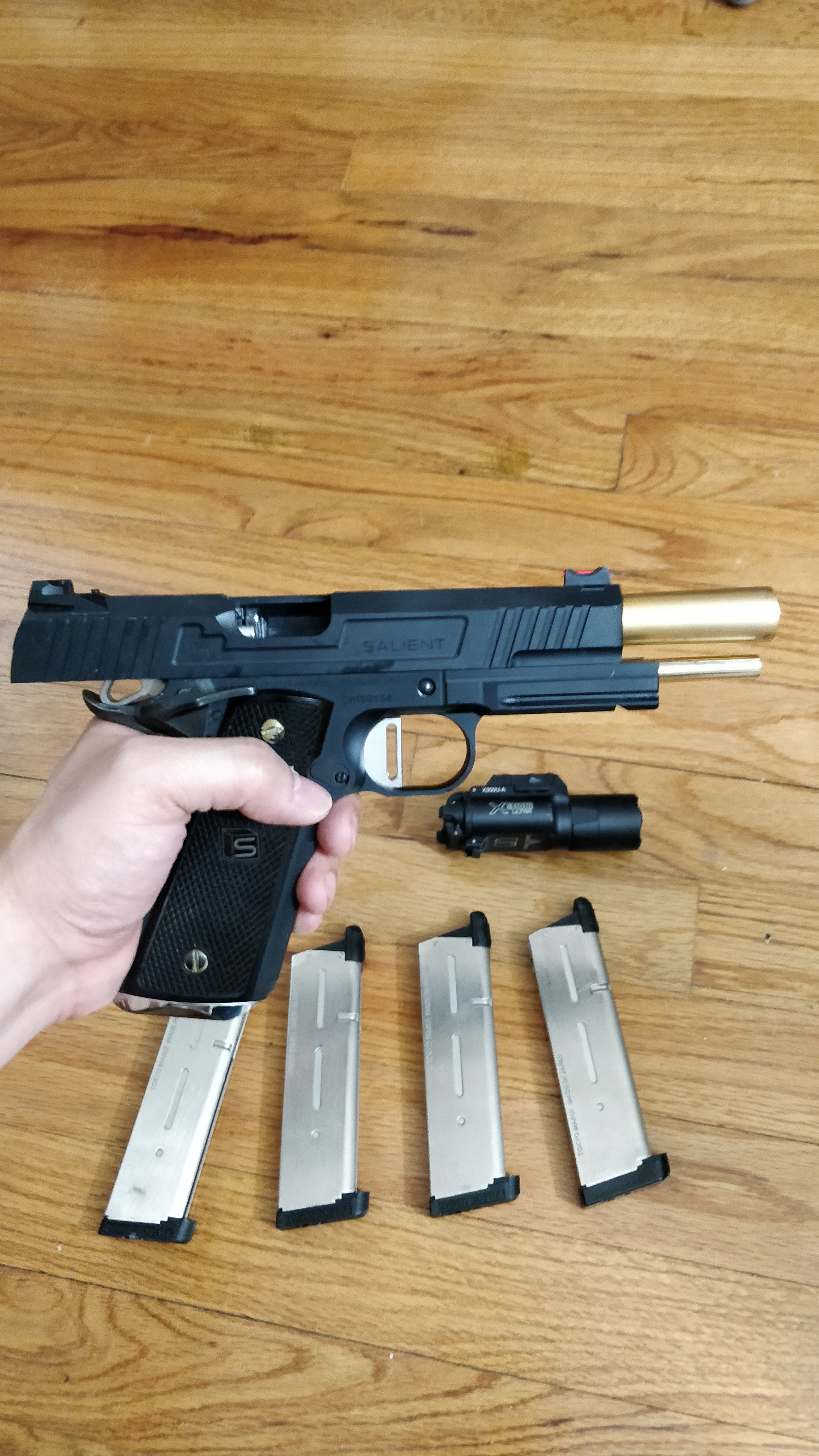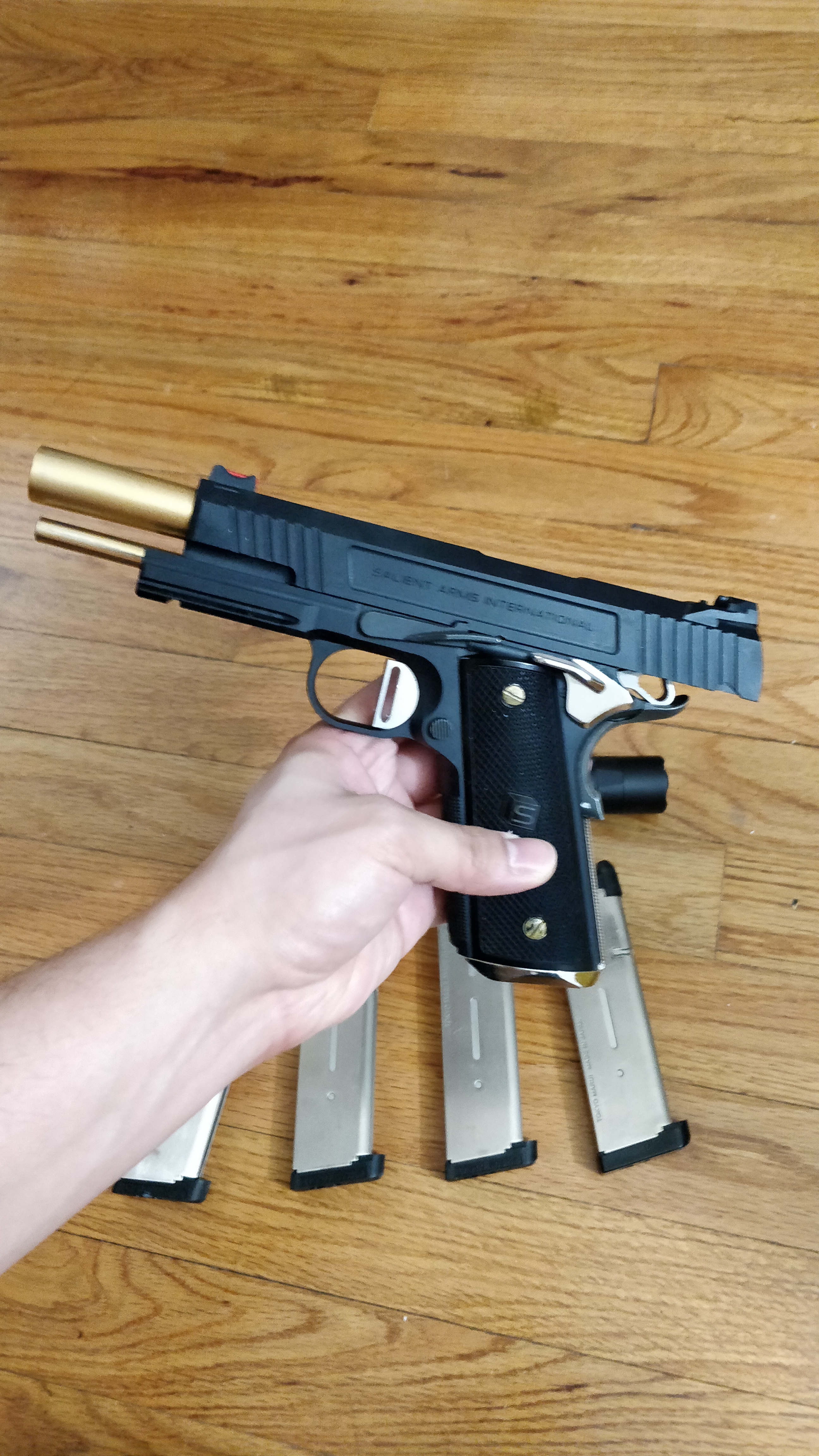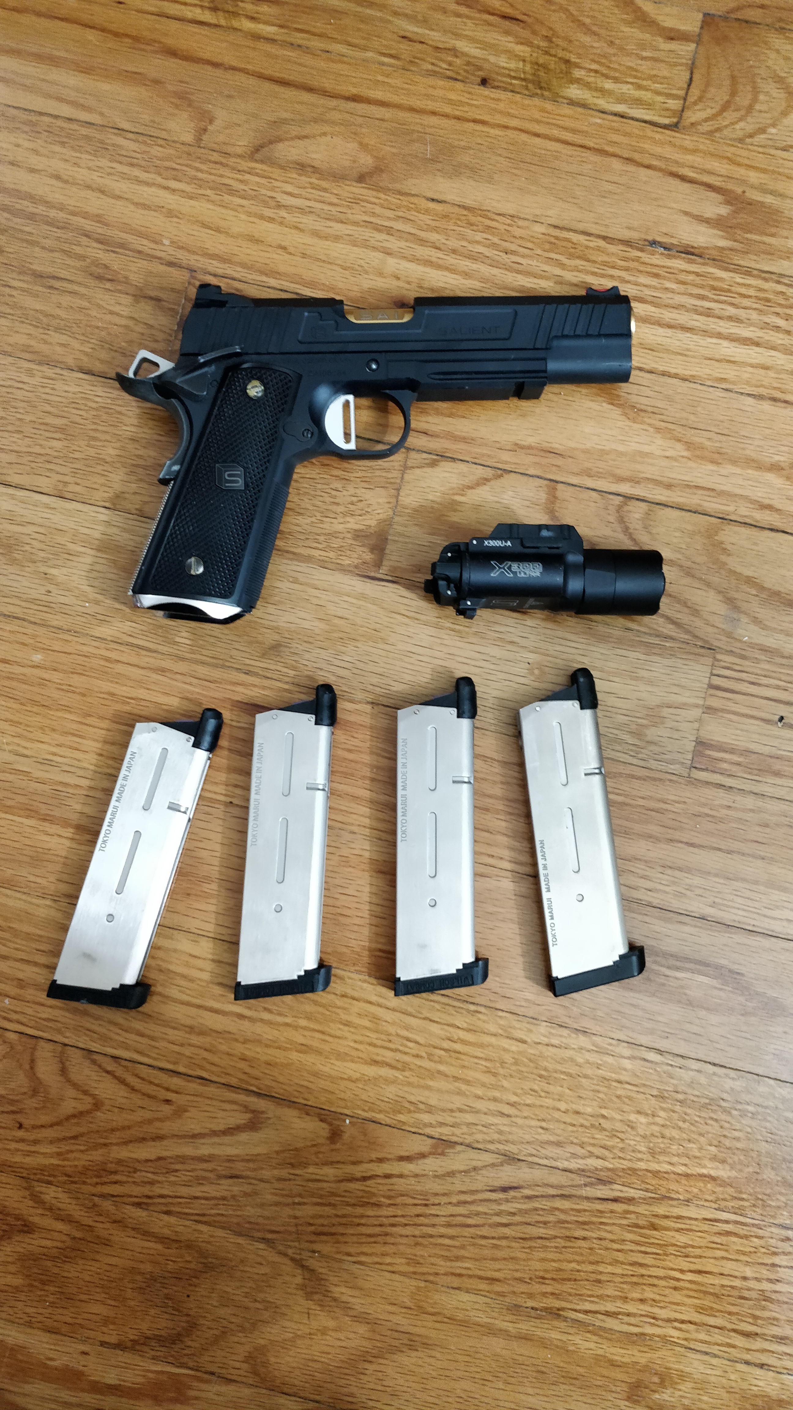 Selling this beautiful piece of work as it's too cold in the Northeast to properly use it sadly and it's just sitting in a case. Tokyo Marui 1911 meu base though there's not much TM left. Upgraded with NOVA internals, maple leaf bucking & wheel, and with rare and discontinued NOVA Sai S-type 5 inch conversion kit, feels extremely solid and weighty in your hands. Shoots straight, nice and far. Kick feels very nice as slide is heavy. No issues performance wise. Comes with 4 non-leaky TM 25 round green gas mags upgraded with nineball purple gas routers and a repro surefire clone.