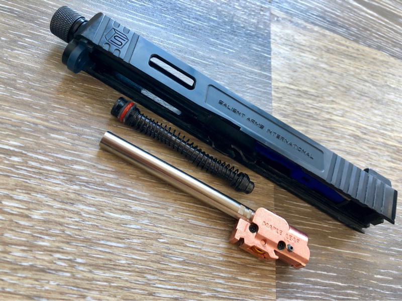 Upgrades- Maple leaf hop up chamber set/ML bucking, PDI 6.01 TBB, front fiber optic, moon dog o rings, new recoil spring (unknown brand, 9ball?) thing is getting 345 FPS consistent, WE Glock lower, reinforced hammer springs , threads/w cap