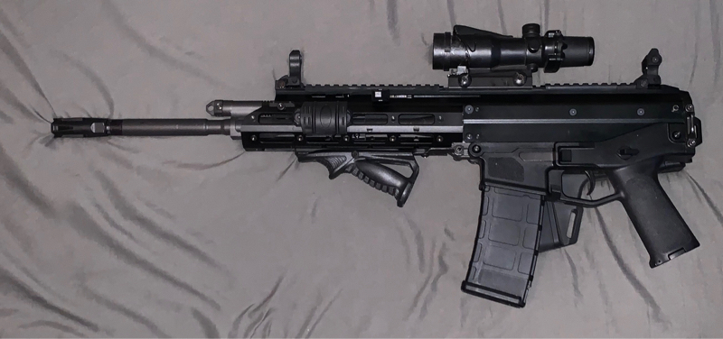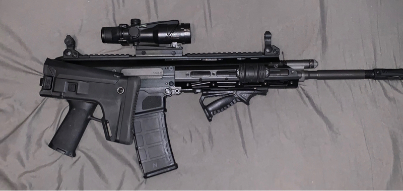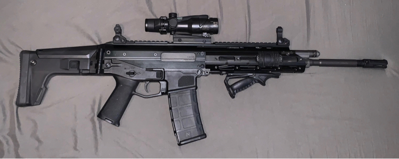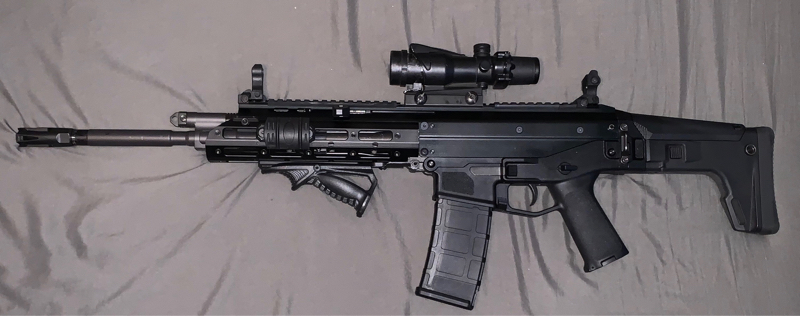 Rail covers, replica 4/32 Trijicon with all the trademarks on it, kill flash, low profile front handgrip, flip up sights