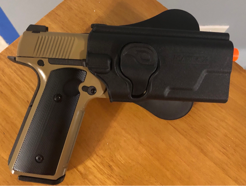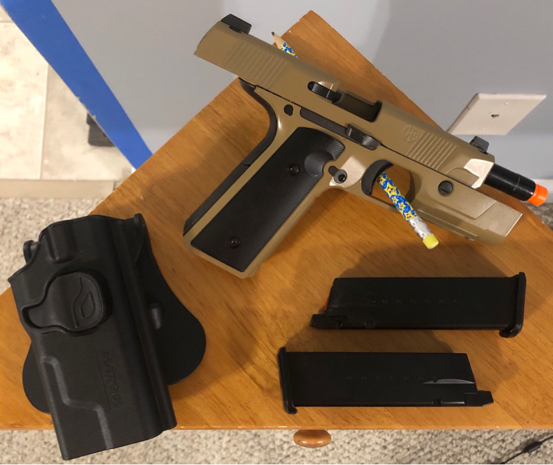 Hudson H9 pistol with 2 green gas mags and Matrix holster with paddle attachment. Like new; used very little, just purchased a new pistol I like more. Gun is a blast to shoot with hard recoil. Pistol will come in the original box.