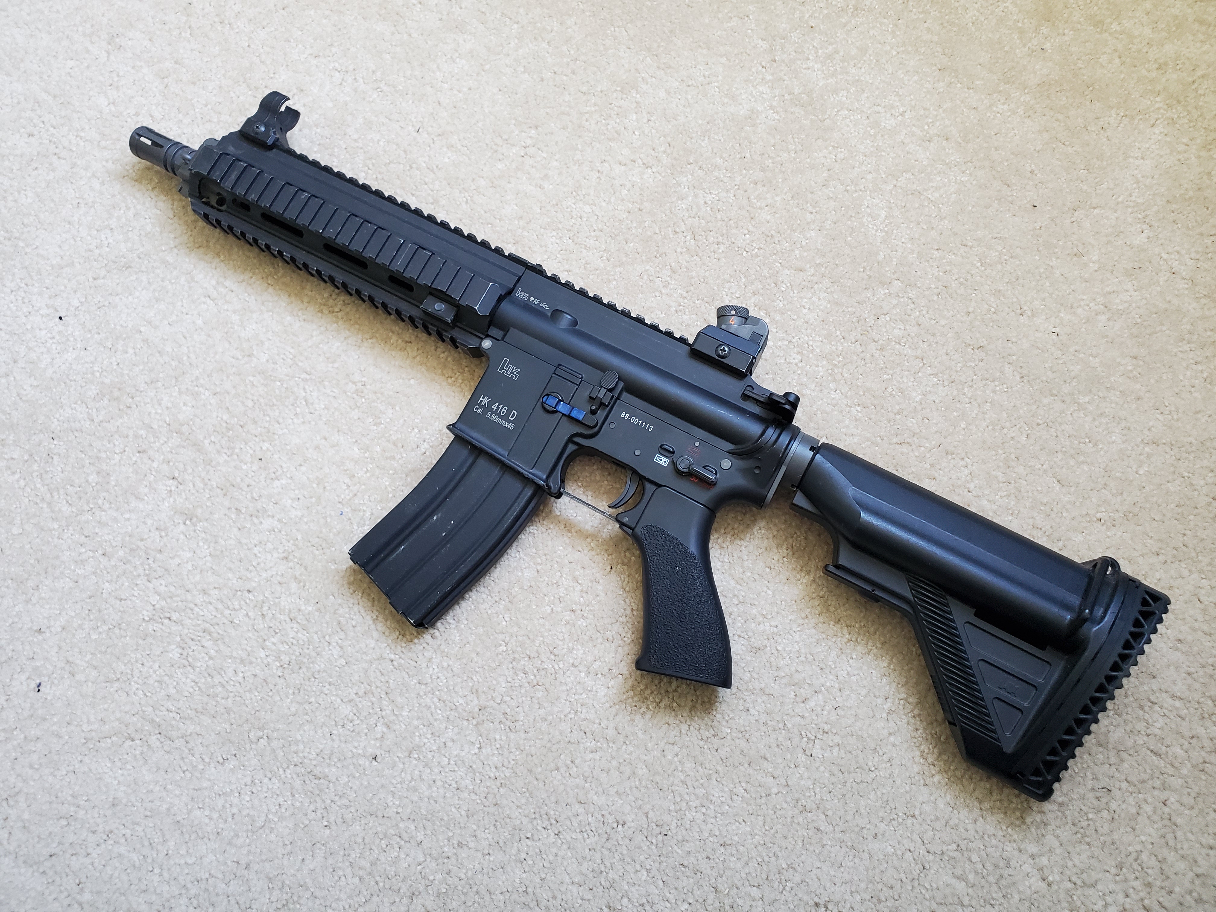 Fully upgraded WE HK416 with trademarks with steel FCG and bolt carrier w/NPAS. Gets stuck using the bolt catch/hold open so it is disabled on the magazines.