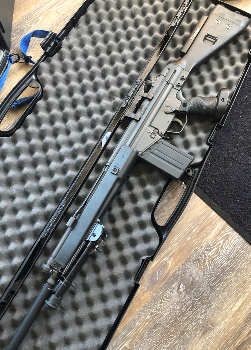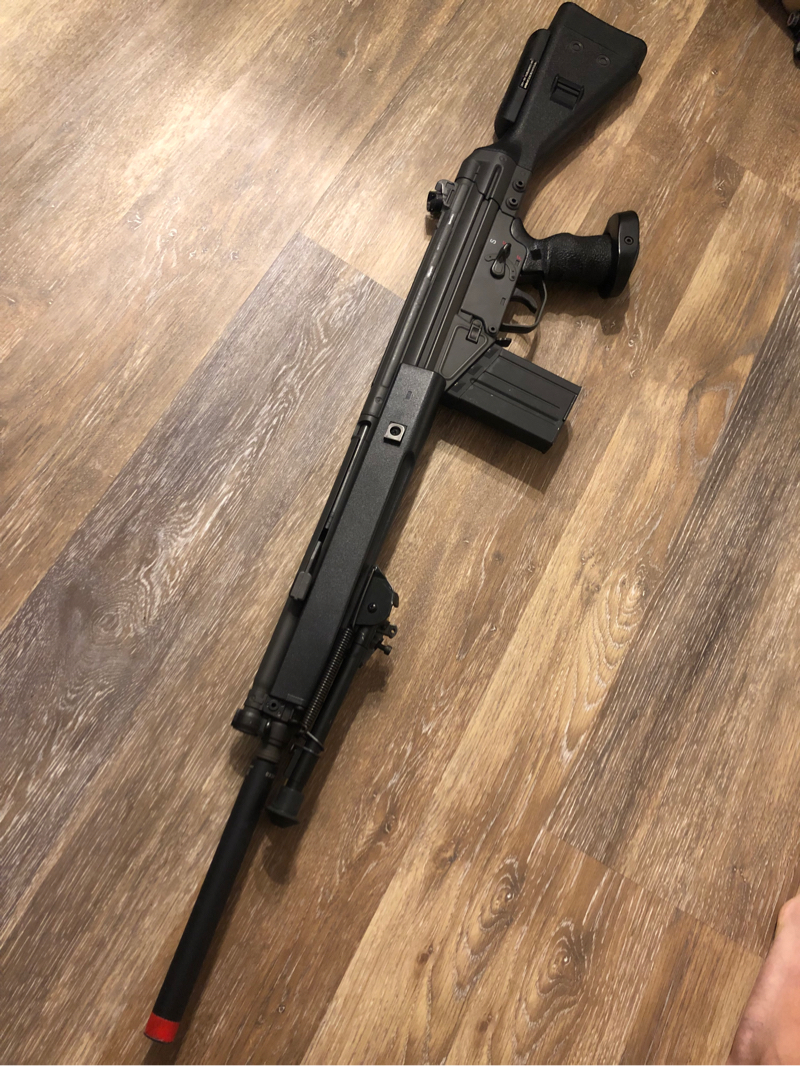 Tokyo Marui G3 with upgrades and PSG-1 grip. Has Prommy TBB 6.01 covered by Tokyo Marui Suppressor, M125 spring shooting 390 FPS with upgraded cylinder. Connected to deans. Lipo ready