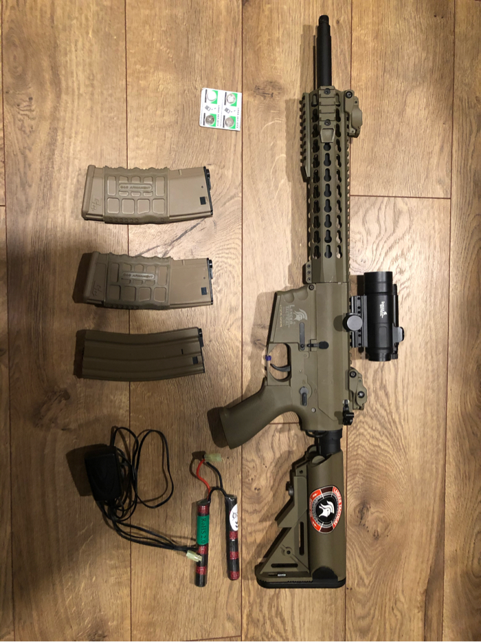 The gun comes with a sight with 4 extra battery’s, a battery, charger and 3 high-cap magazines also your bot outing for the selling fee I am