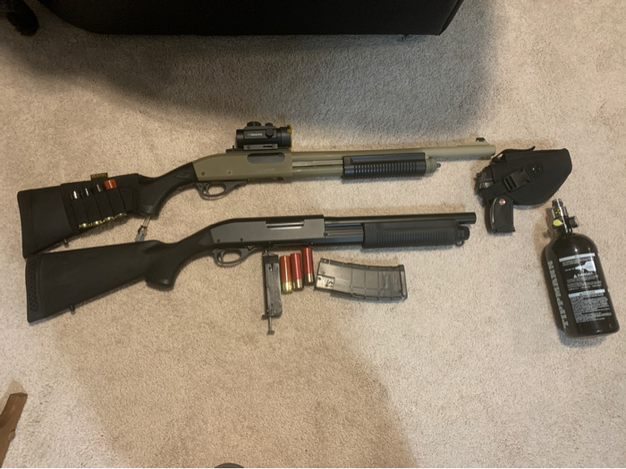 Jag arms scatter gun with a manual pump shotgun. Speed loader 8 shells a rugged pistol and tip man air tank. Getting out of air soft $80 usd after fees seller pays shipping.