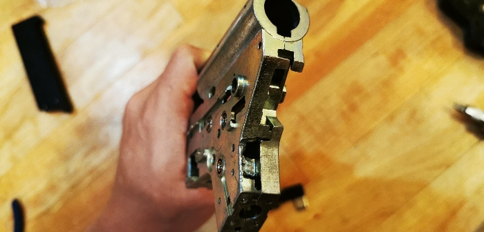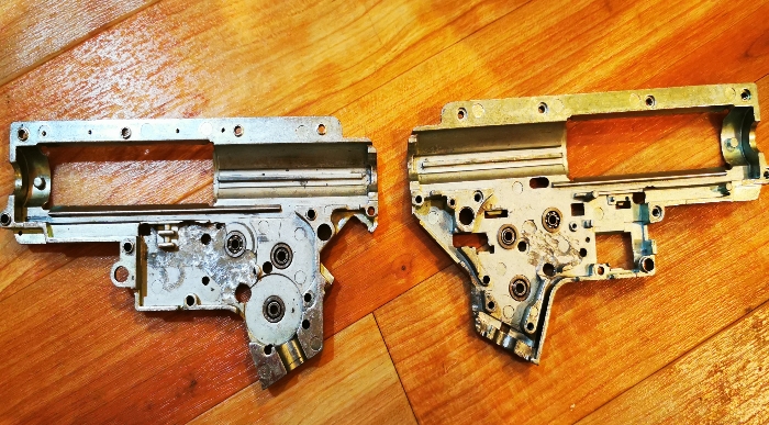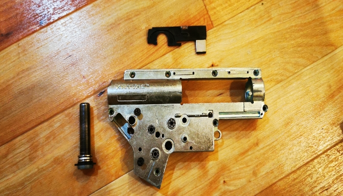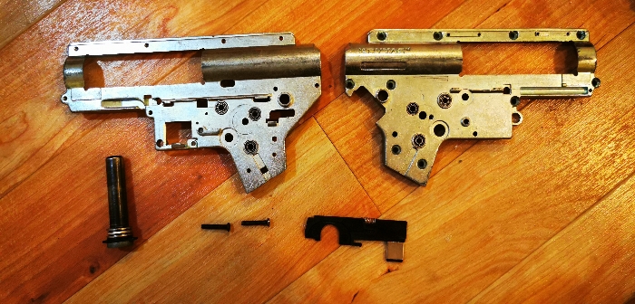 comes with the selector plate, ball bearings, and QD spring guide. also comes with two screws - this shell uses two extra screws over a regular v2 gearbox, so you can just swap over the screws in whatever gearbox you are using. if this is an issue for you, just let me know and I can run to the local hardware store and get you a full set of screws. has been grinded with a dremel to fit wires out of the back, and to effectively fit the Gate Mosfet optical sticker. does not at all affect performance.