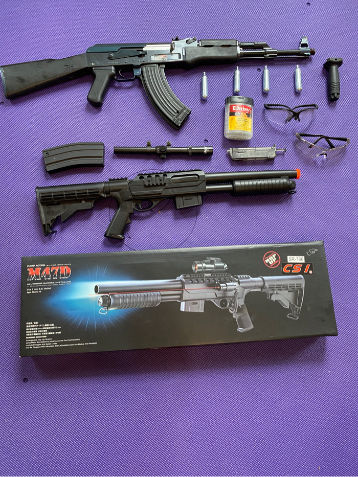 Co2 cartridges, bbs, bb loader, two guns, and safety goggles