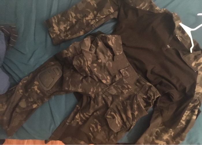 Comes with 1 shirt and 1 pants. Adjustable waistband. Polyester/cotton. Worn once and then washed & dried. Comes with kneepad inserts. Very tough and durable stitching, no rips. Fits size L best (30-38 waist, L or XL chest, height 5’9” - 6’2”, weight range 160-200 recommended). I’m 5’11” and 170 lbs and it fits me pretty well.