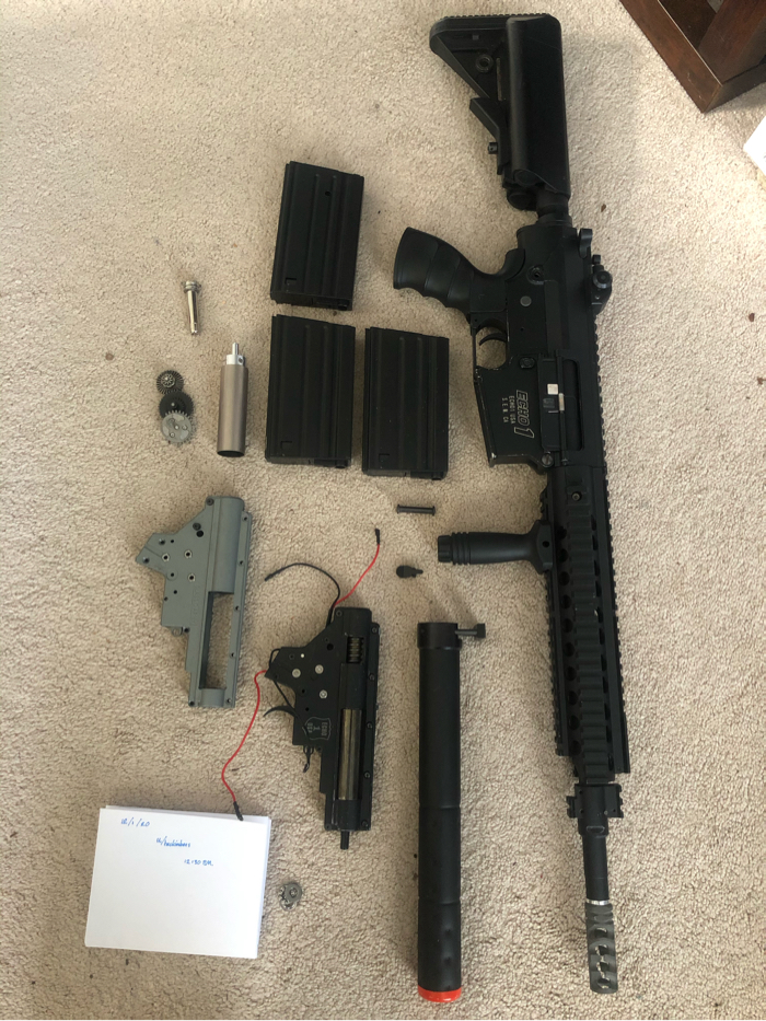 Was testing fitment for the listed gearboxes in this gun since the original Echo1’s was not quite a v2.5 gearbox. Classic Army one fits fine, but I didn’t have enough parts to make a full gearbox. Resting inside is the A&K gearbox which functions fine, but won’t feed for some reason. Also, the gearbox’s hole that the rear takedown pin goes through needs to be widened a bit. Finally, the charging handle needs a new spring.
