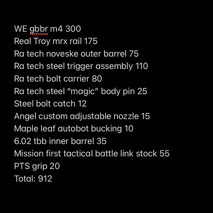 While the base gun is a WE gbbr, very few pets have been left WE, with the majority being upgraded to RA-Tech steel parts or real ar-15 parts. Parts list is in final page. Value is $912 but I am only asking $465 for it as I am in need of cash fast for a project.