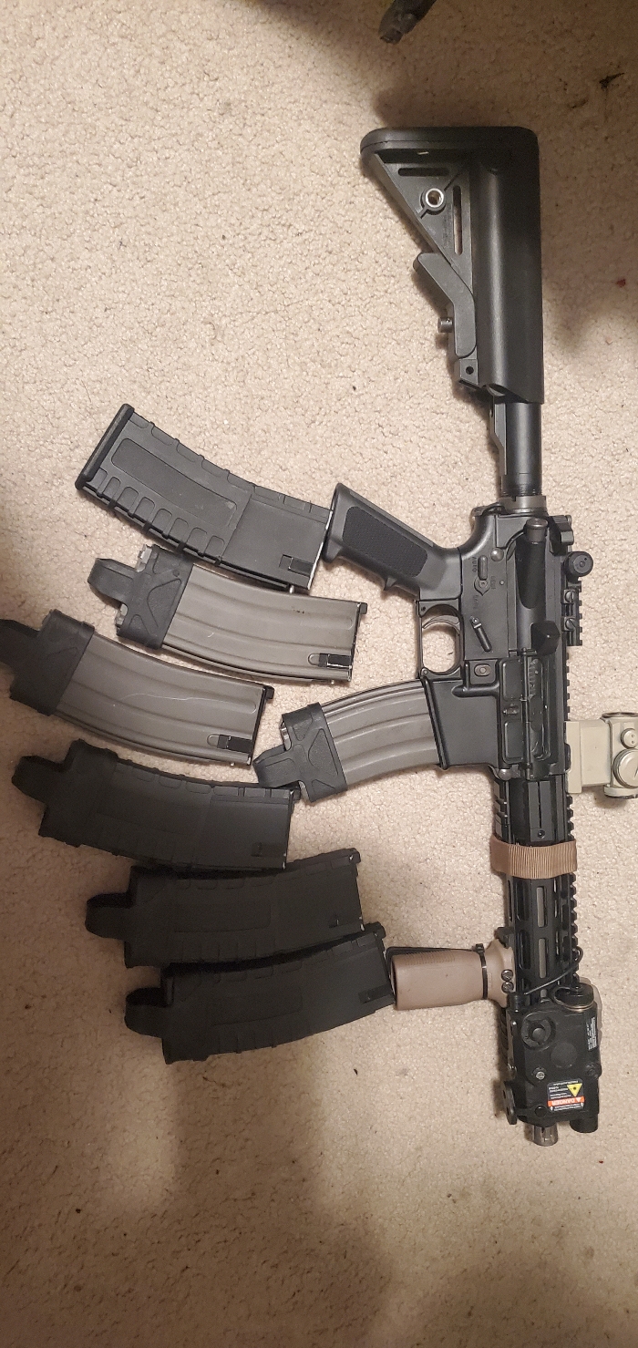Ghk m4 comes with 7 mags 1 leaks. Sight and peq not included