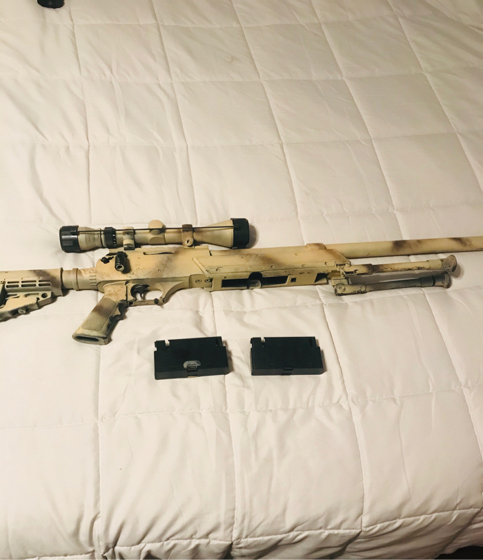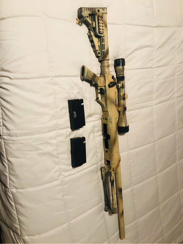 Here I have an echo one sniper. It shoots fine I just have too many guns. Comes with 2 mags, a speed loader, 3-9x scope, and bipod. Great for if you are moving from M4 to sniper. Shoots beams. I am open to trades or just cash.