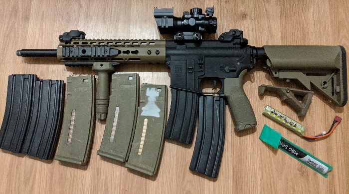 Price is shipped and includes the vertical grip, battery, and 3 mags.