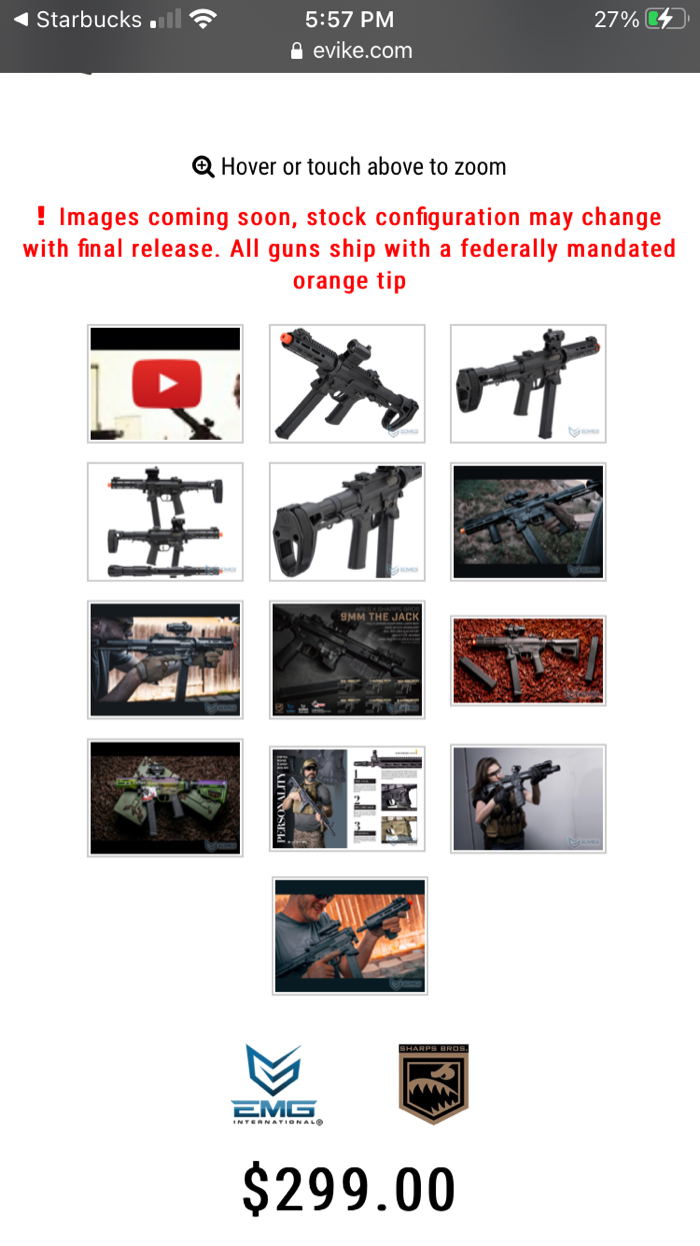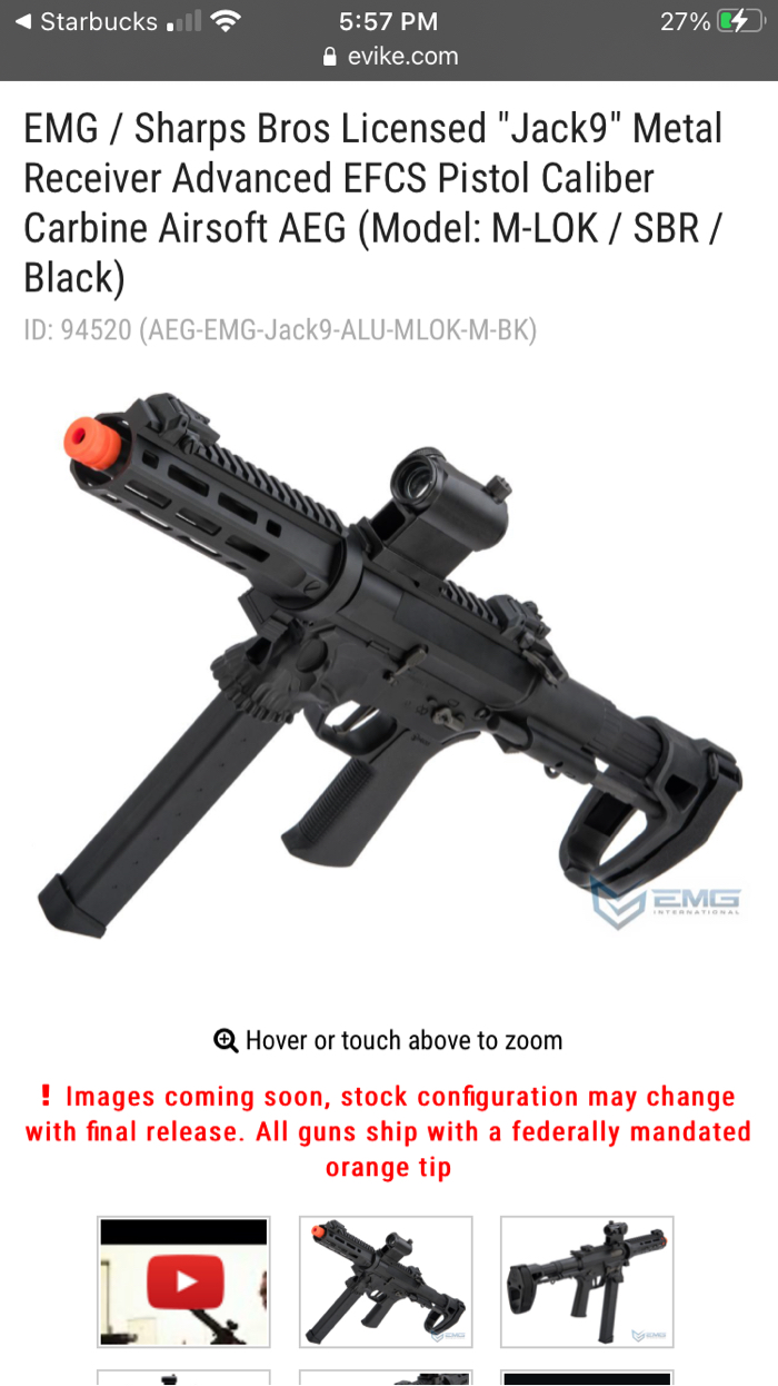 new in box EMG / Sharps Bros Licensed "Jack9" Metal Receiver Advanced EFCS Pistol Caliber Carbine Airsoft AEG (Model: M-LOK / SBR / Black). $299 on evike asking $260 obo. negotiable, message w best offer