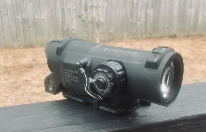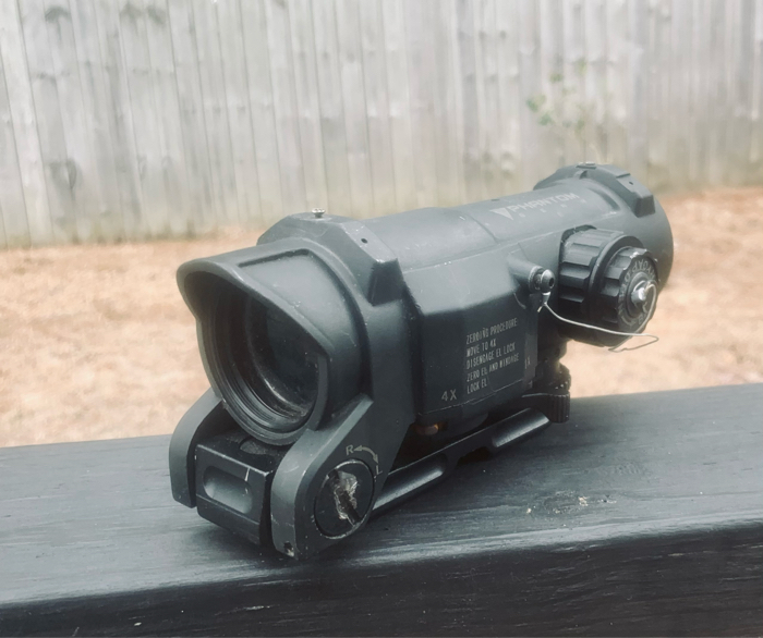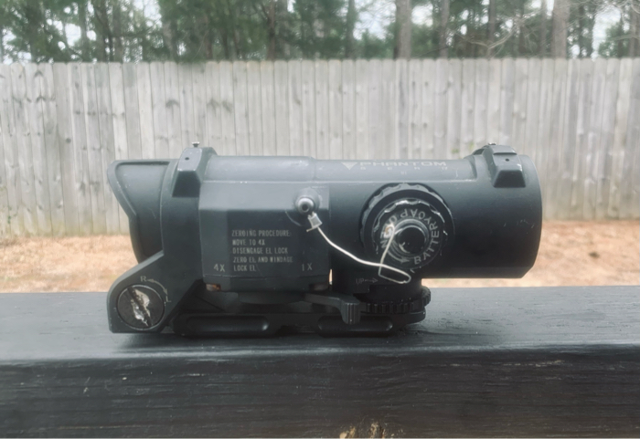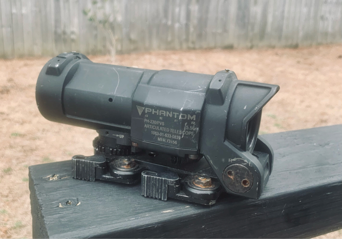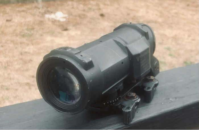 This ELCAN scope has a lot of wear and tear on it but still gives shooters a good sight picture and functions as well as any other replica airsoft sight.