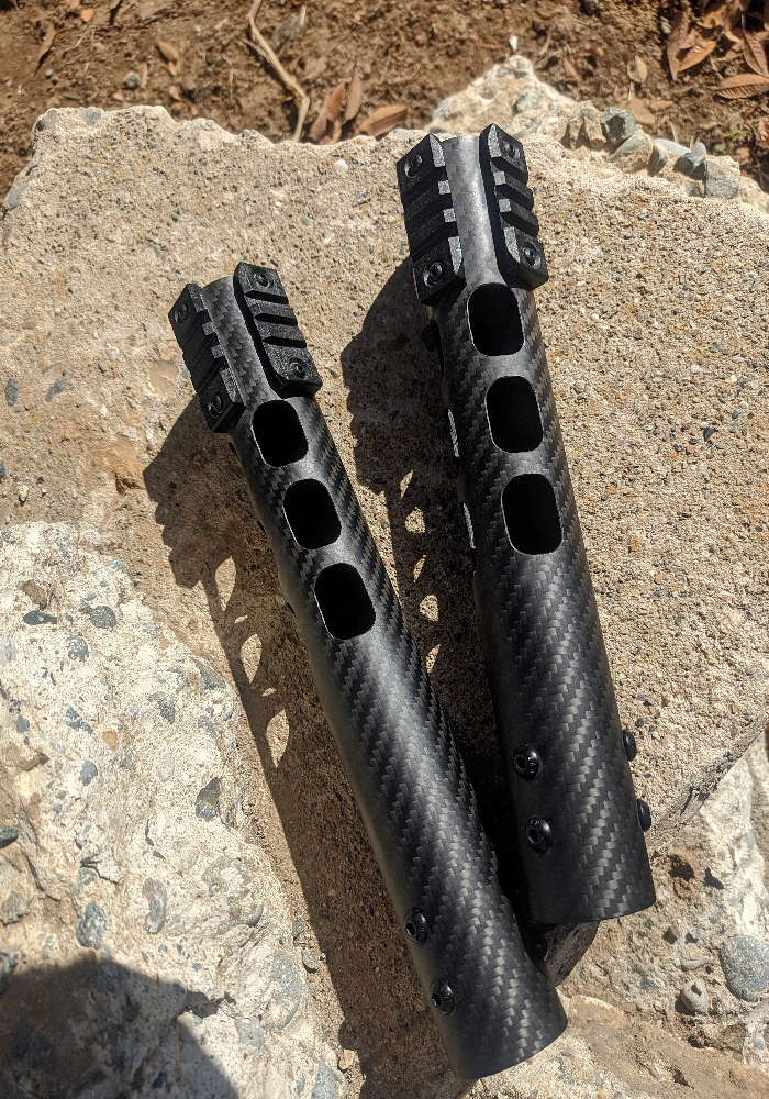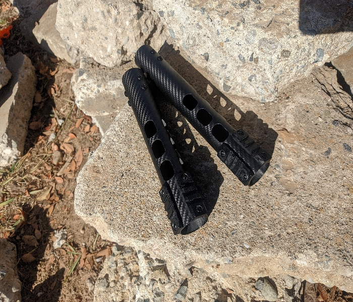 Lightweight carbon fiber Handguards! Made to be as badass as possible. Price depends on length, cutouts, and rails, all of which are customizable. Insides mounding hardware and barrel nut.