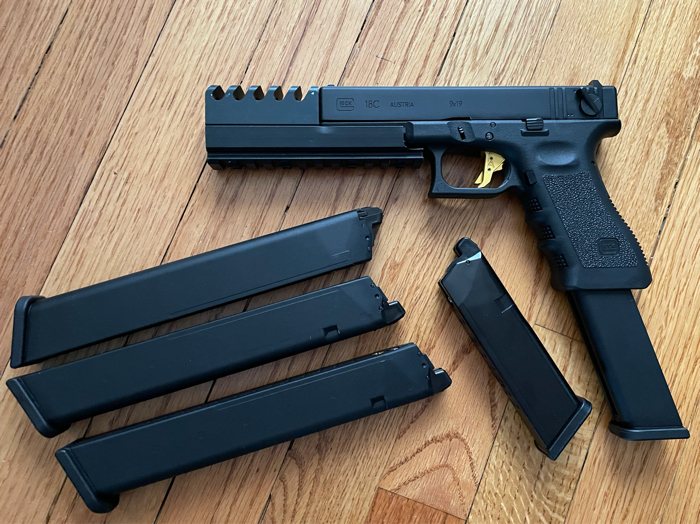 Agency Arms gold trigger, older compensator, 4 extended mags and one action army magazine.
