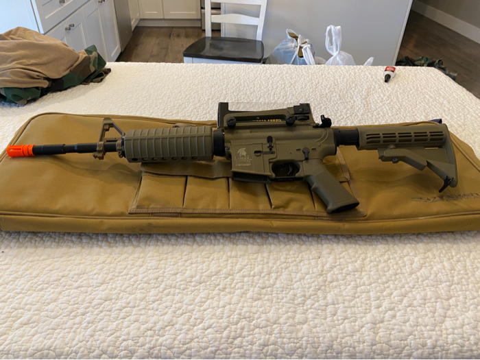 Lancer tactical m4. This gun is in good working order. The internals are stock but it does have an upgraded Lonex barrel. Comes with the Valken tactical gun case! Was just serviced by my airsoft store so it’s ready to go!