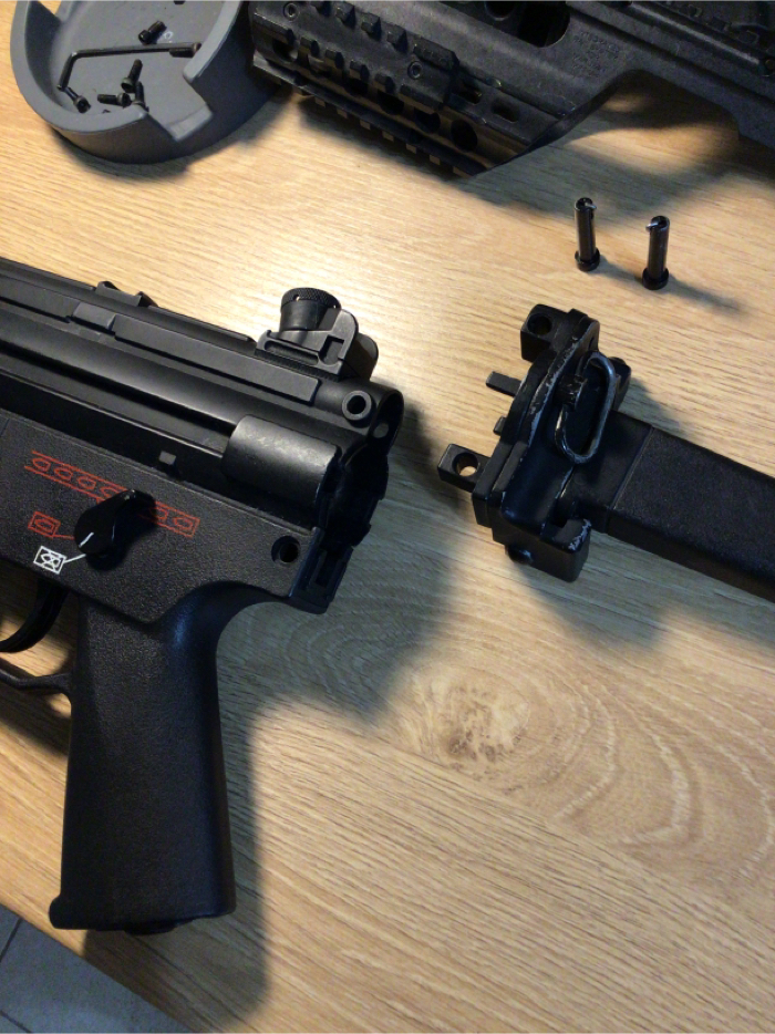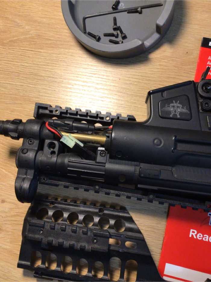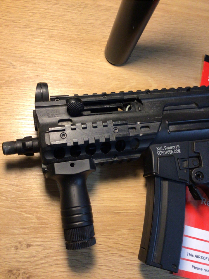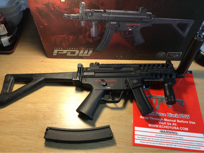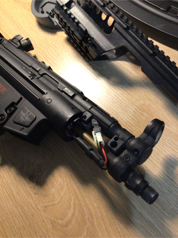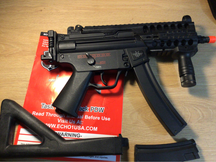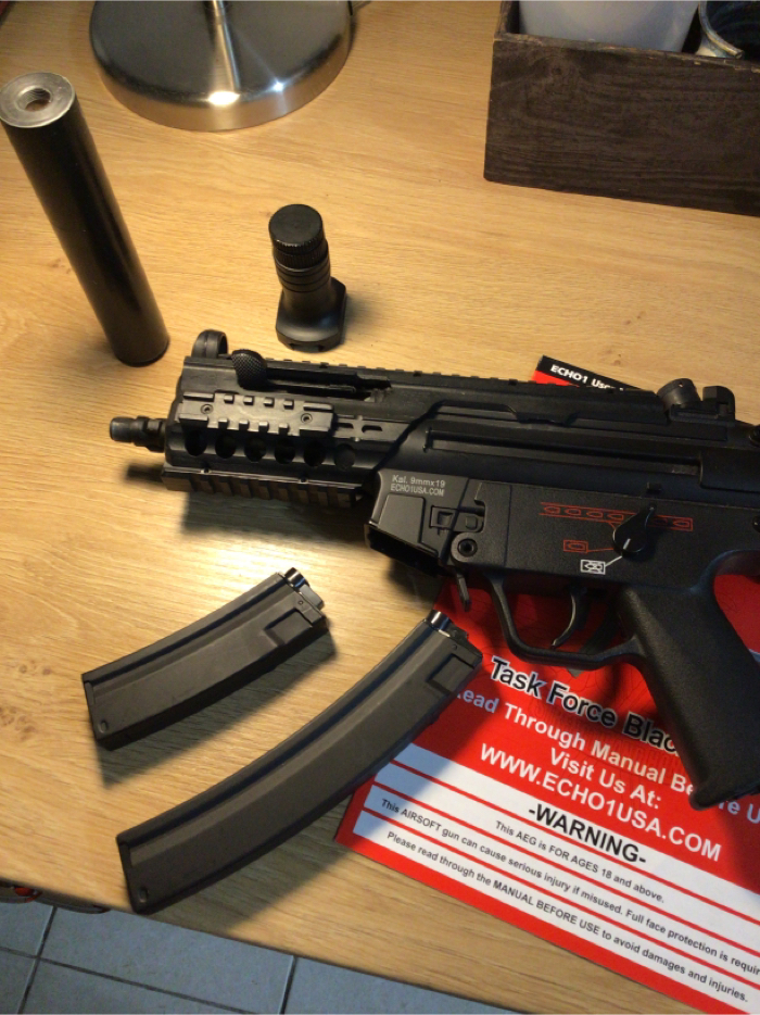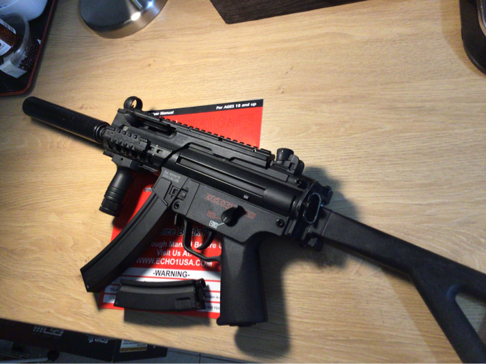 For its size, this thing is a BEAST. Feels hefty, like the real deal, Hits hard(370-380FPS), and high ROF. It was crazy hard to find a stick battery that’s small enough to fit inside the tiny pocket right above the gearbox . I took the rail system off of my old Maruzen Mp5 Charger GBB, so that I could put some sort of a PEQ box or a fore grip with a bigger battery in it. It took awhile, but I found a SOCOM GEAR 11.1 V 1000mAh that fits snugly inside now. Just in case 11.1V is too much for ya, I will add on a Firefox 7.4V stick too. NO LIPO CHARGER INCLUDED! This sale comes with a fully functional MP5K, with Maruzen CQB rail system, short fore grip, faux suppressor, high cap and a low cap magazine, instruction manual and a folding stock that is broken, but maybe able to TLC.. SOLD AS-IS. NO TRADES. NO RETURNS. No discounts. Only payment I take is HOPUP. It will be shipped in its original box, along with a blaze Orange tip. This little punisher needs a good home. Get it!
