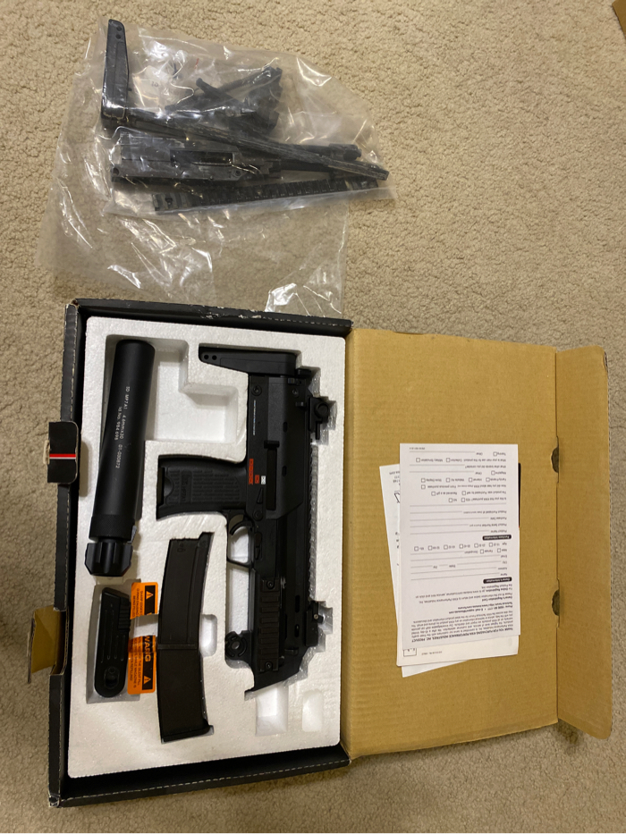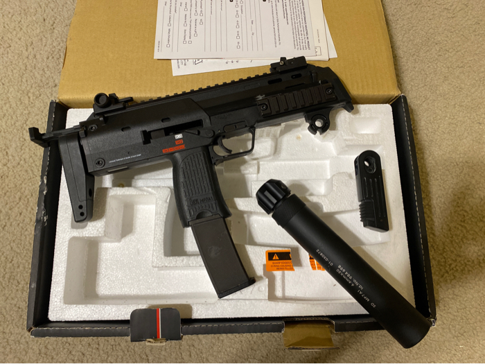 Never fielded KWA MP7. Still looks brand new other than the scratch marks on the stock. Comes with mock QD suppressor (used to be a power up suppressor until I heard they were bad for your mp7). The suppressor still works for a longer inner barrel though. It’s missing the QD and original flash hider. Also missing hardware to attach the front grip to gun (I lost it when I decided I wanted to paint the front grip and later decided I didn’t like the paint so took it off). Comes with a bag of several replacement parts that were lifted from a KWA MP7 with a broken frame. Comes with one mag. Still worked fine when I used it a couple months ago