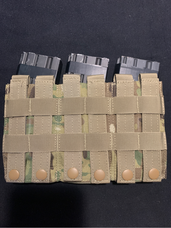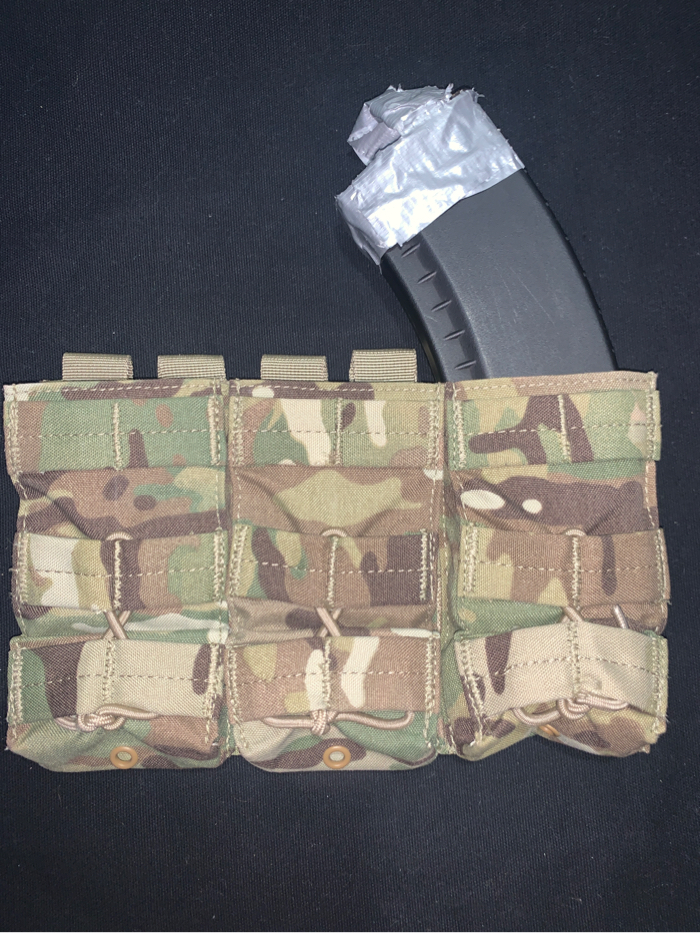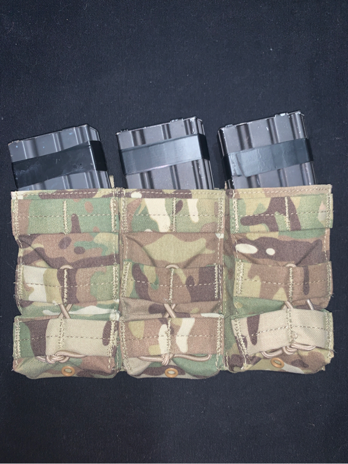 This is a open top triple Mag pouch in genuine Crye Multicam. The pouch holds 3 AR platform or 5.45 Platform AK magazines via a bungee retention system. In like new condition. Magazines not included.