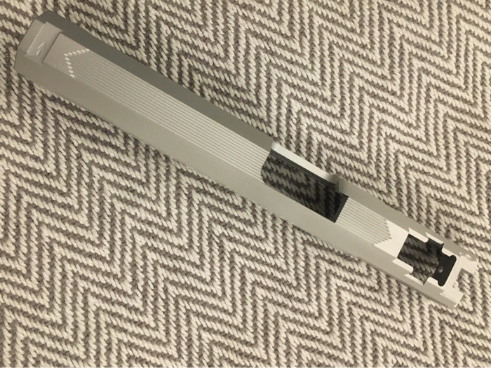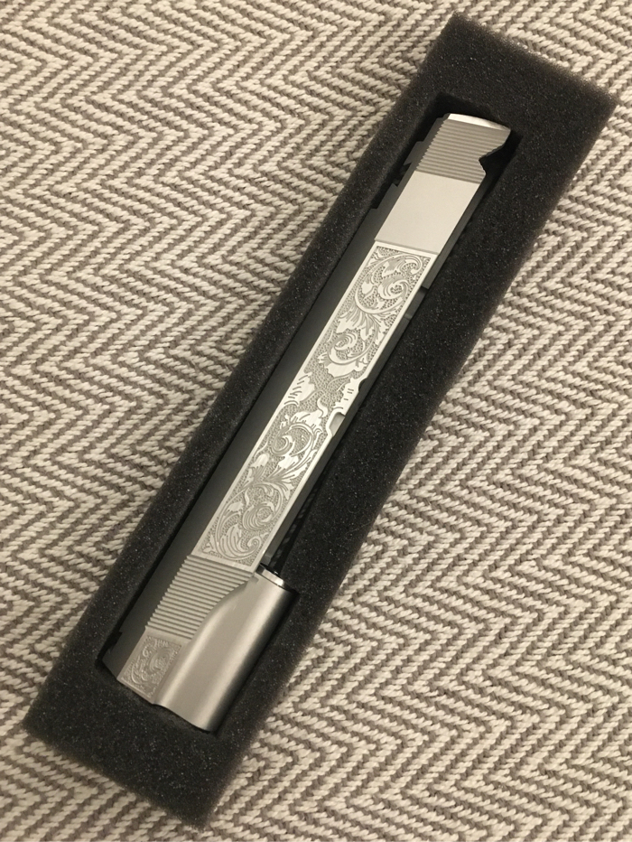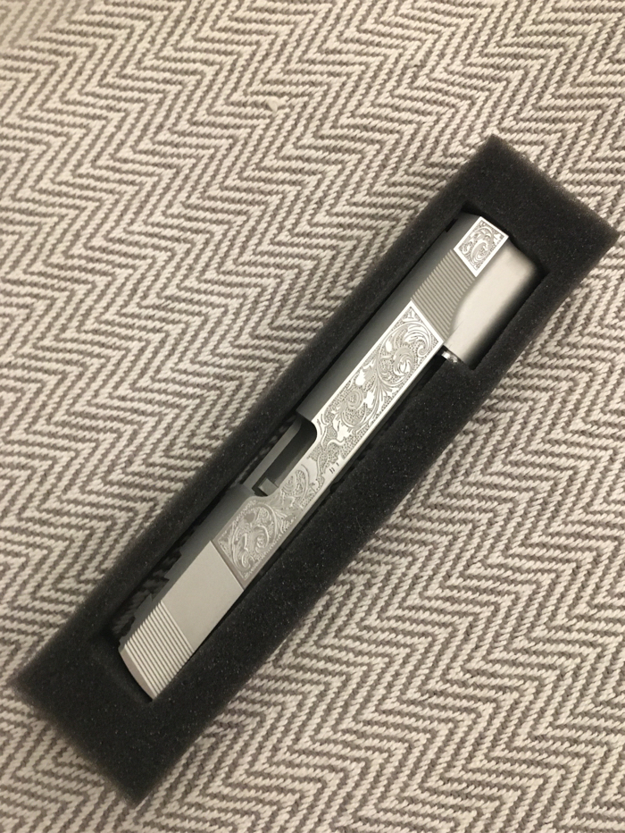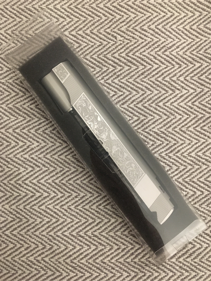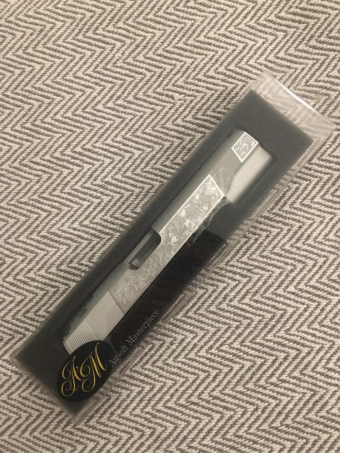 This is a 100% mint condition Airsoft Masterpiece "Gothic" Standard Hi-CAPA/1911 Slide in Silver/Silver or "Raw" aluminum. Will fit Tokyo Marui Hi-Capa 5.1 pistols and most other Hi-Capas. This slide has never been put on a gun, it has zero rounds through it and will come in perfectly unused condition with full original packaging straight from Hong Kong. It is is not shrinkwrapped inside the box, because it did not come in shrinkwrap from the factory. Absolutely beautiful, lightweight slide with the outline/silhouette of a traditional, full slide and no aggressive cuts like the more slimmed-down/lightweight slides have. Both sides of this slide feature incredibly intricate engraved carvings in a "Paisley" or "Bandana" pattern at both the front and the middle of the slide. This slide is probably the most beautifully engraved slide I've ever seen, and it is the ONLY Gothic slide that I've ever seen in ALL Silver (Silver/Silver or "Raw" aluminum). These Gothic slides are hard to get in any color these days, but I think it would be nearly impossible to find another fully silver Gothic slide, especially one in mint condition like this. It's beautiful to look at right now, but I'm sure it could be anodized very smoothly from its current raw state if that's what you're looking for. These are from a batch of slides released years ago and I doubt any exist in this condition today. Comes with an Airsoft Masterpiece raw aluminum recoil spring guide rod plug, and will be nicely wrapped in tissue paper inside the box in place of the shrinkwrap that most slides typically have. I can ship anywhere in the U.S. without any issues, but please message me if you'd like me to ship internationally and we will figure it out. I can make a deal on it if you're buying something else and I'll ship together. I can also deliver this in person if you're local. Please let me know if you'd like more pictures. Thanks.