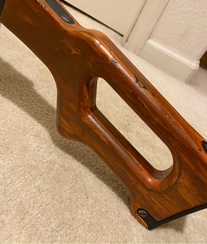 I had custom painted the faux wood on using an airbrush and sealing it. It has some wear and tear but still looks great.
