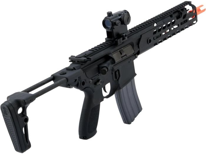 The SIG AIR ProForce MCX Virtus airsoft rifle is a battery-powered, automatic electric gun (AEG) that runs on a rechargeable battery. The airsoft rifle features an adjustable hop-up creating spin on the BBs for additional stabilization in flight, resulting in increased distance and accuracy. Equipped with interchangeable springs for velocity enhancement, the SIG AIR ProForce MCX Virtus has three fire control modes (safe, semi-automatic, and automatic). The included magazine holds 120 rounds of 6mm polymer or biodegradable BBs, with a velocity up to 400 fps and muzzle energy of 1 joule (using a .20-gram polymer BB.)