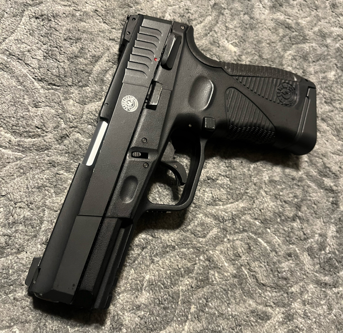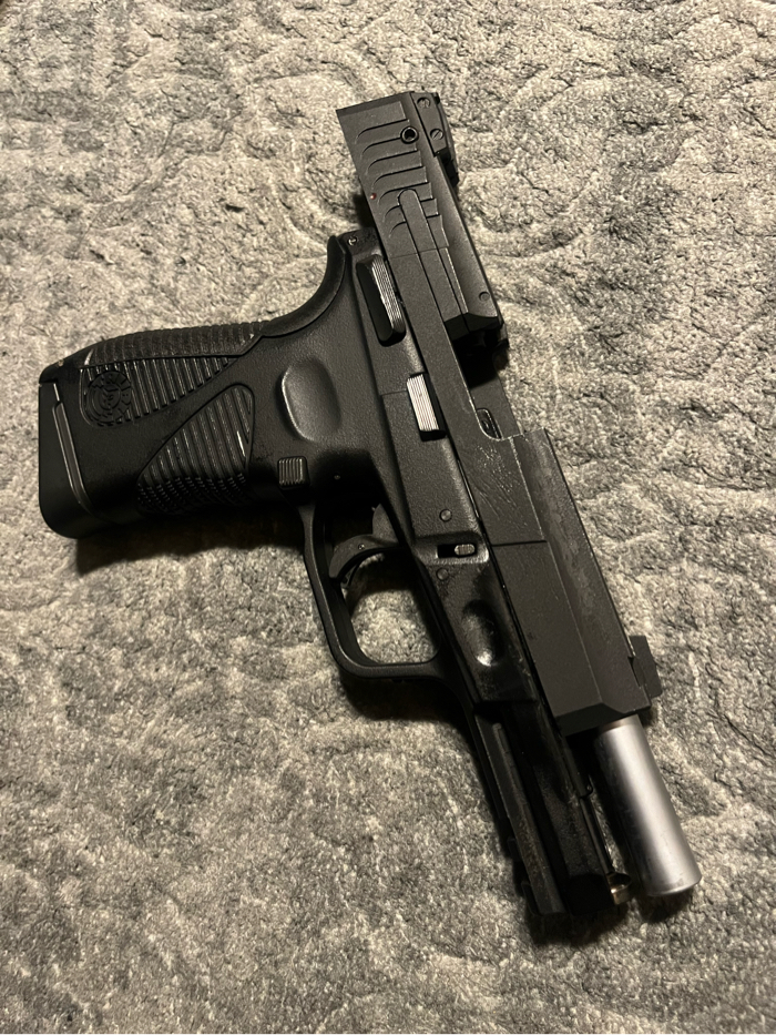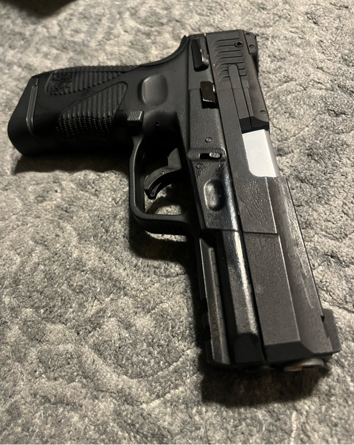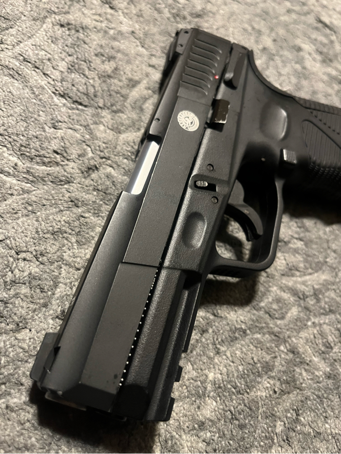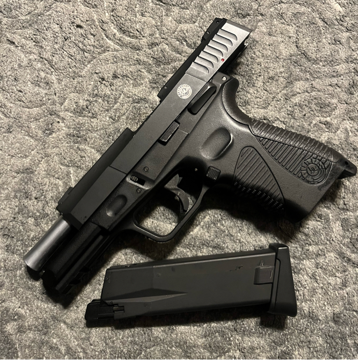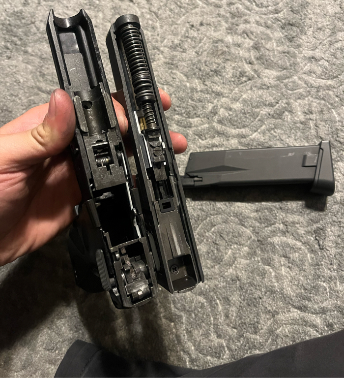 Comes with one non leaky magazine! Full metal upper and polymer lower just like the real deal! Oiled and kept maintained! Had a small scratch on the side but has been touched up. Shoots extremely hard, very snappy recoil. Slide catch works great and is ambidextrous. Amazing tool for at home dry fire/ live fire training!