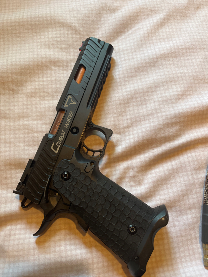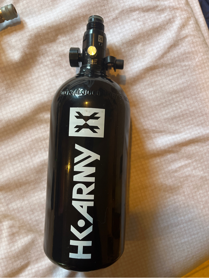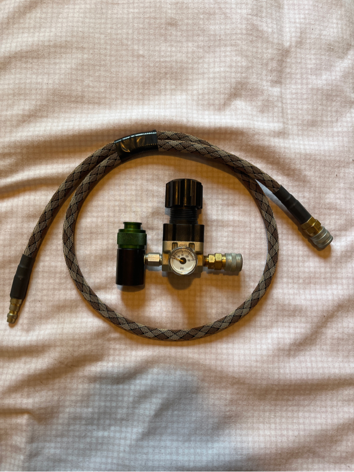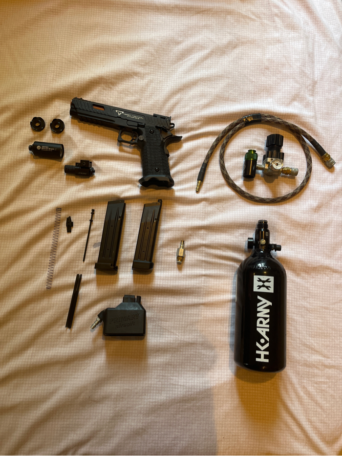John Wick Gas blow back pistol. Used in 5-10 airsoft battles. Comes with BRAND NEW HK-ARMY HPA tank/hose/Primary Airsoft attachment. Also comes with 2 mags, one needs cheap replacement part to stop bbs from coming out. Also comes with laser attachment. Just to be clear I have only used the gun/mags and laser. The HPA setup is brand new and has never been used. Everything is in working condition except for the one mag which needs a replacement part.