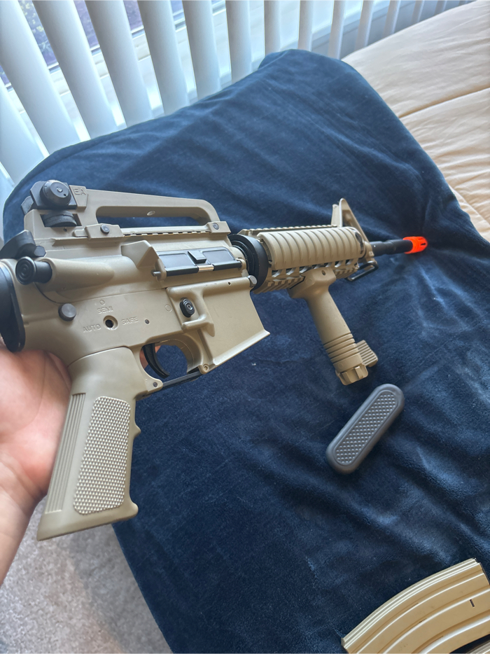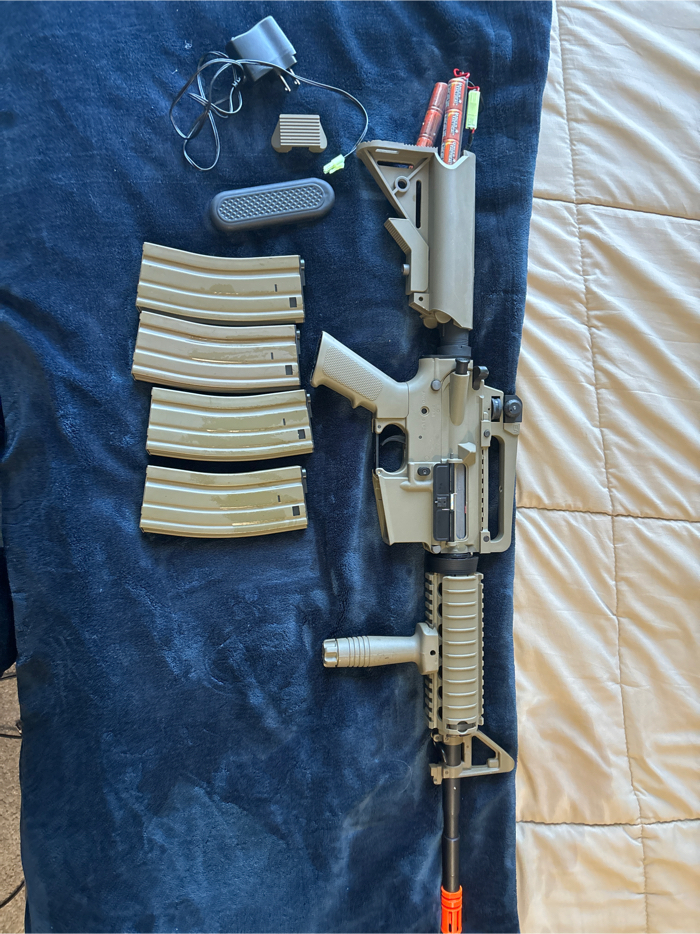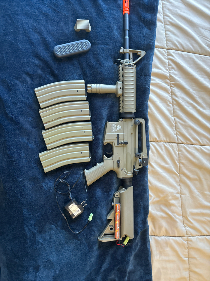 AEG m4a1 Lancer tactical has been used 1-10 times and yes every thing still works 75% metal and 25% plastic , kept in good condition had it for about 1-2 years barely used it comes with 4 mags filled with 500, 20. BBs , default battery and charger gun can last about 4-8 hours fully charged very few scratches only on one mag and thats it can negotiate a price if wanted 350-450fps
