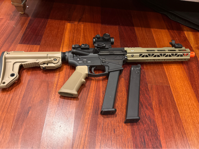 Comes with 2 mags (one leaky) along with a 40 dollar optic