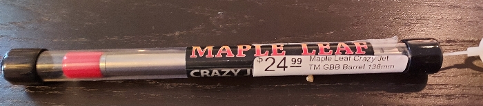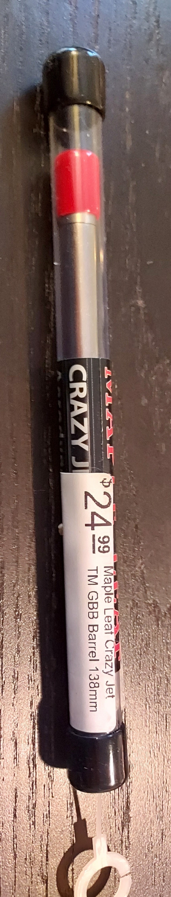 The Maple Leaf Crazy Jet Barrel System is a super cool inner barrel design for airsoft gun upgrades. A 6.02mm precision Maple Leaf inner barrel with a finely tuned end piece that is slightly larger to create an "air cushion" surrounding the BB as it exits the barrel. This system reduces air turbulence as the BB leaves the barrel, greatly increasing its accuracy and intended trajectory. The barrel end is 6.12mm inner diameter to create the air insulation.
