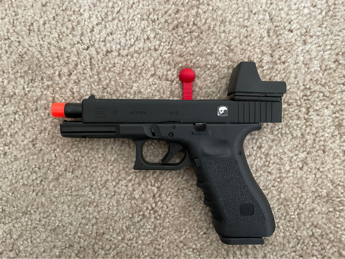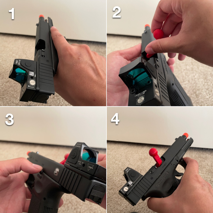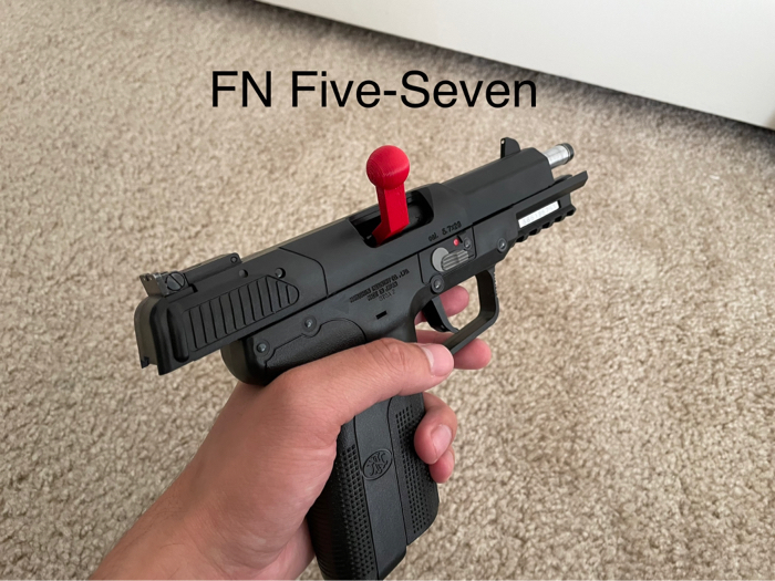 The chamber flag works by preventing the slide or bolt from completely moving forward, making you unable to shoot it. It does so by seating itself slightly inside the barrel and staying in place when the slide/ bolt presses against it. If you want to shoot, simply pull the slide/ bolt back and take the flag out. It is also designed in a way to allow for you to still be able to lay the gun flat on its side for normal storage.