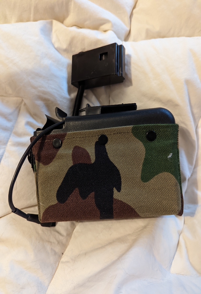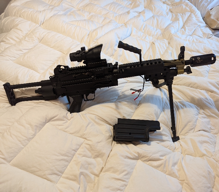 Classic Army M249 LMG, Wolverine Inferno Gen 2 engine, MAG 1500rd Box Mag, Ninja 3000 psi tank with Wolverine adaptor and line, EPES CNC machined hop up, 6.08 custom inner barrrel with a G&G green bucking and flat hop, Titan 7.4 LiPo battery and Titan charger, and an offbrand Acog.