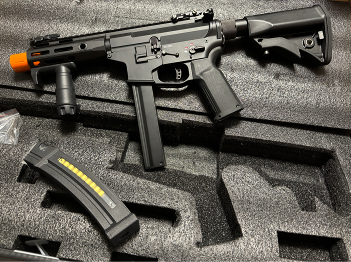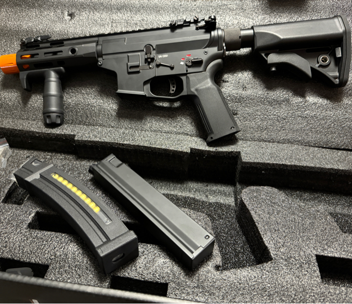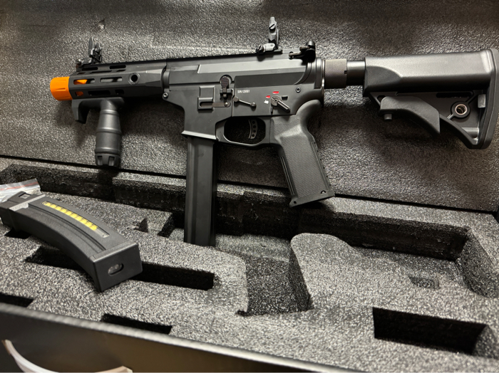 The carabine in the new E-EDITION & HIGH-SPEED configuration has a velocity of around 330 fps and, in combination with a LiPo battery, a ROF around 25rps and a faster trigger response. This was achieved due to the new gearbox parts with increased durability, such as: