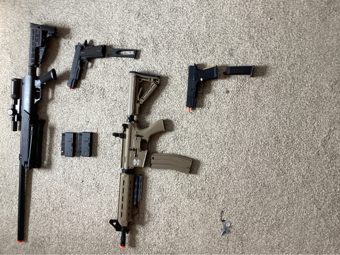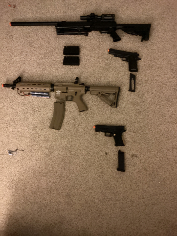 g&g armament cm16 raider with a 9.6 volt NIMH battery and a high cap mag,echo1 ASR spring loaded sniper rifle with two mags,Colt 1911 Co2 hand gun with one mag,EMG international green gas glock hand gun with one mag