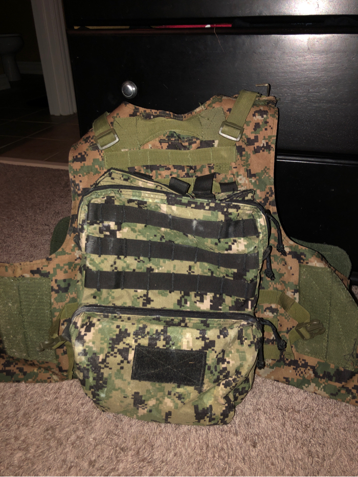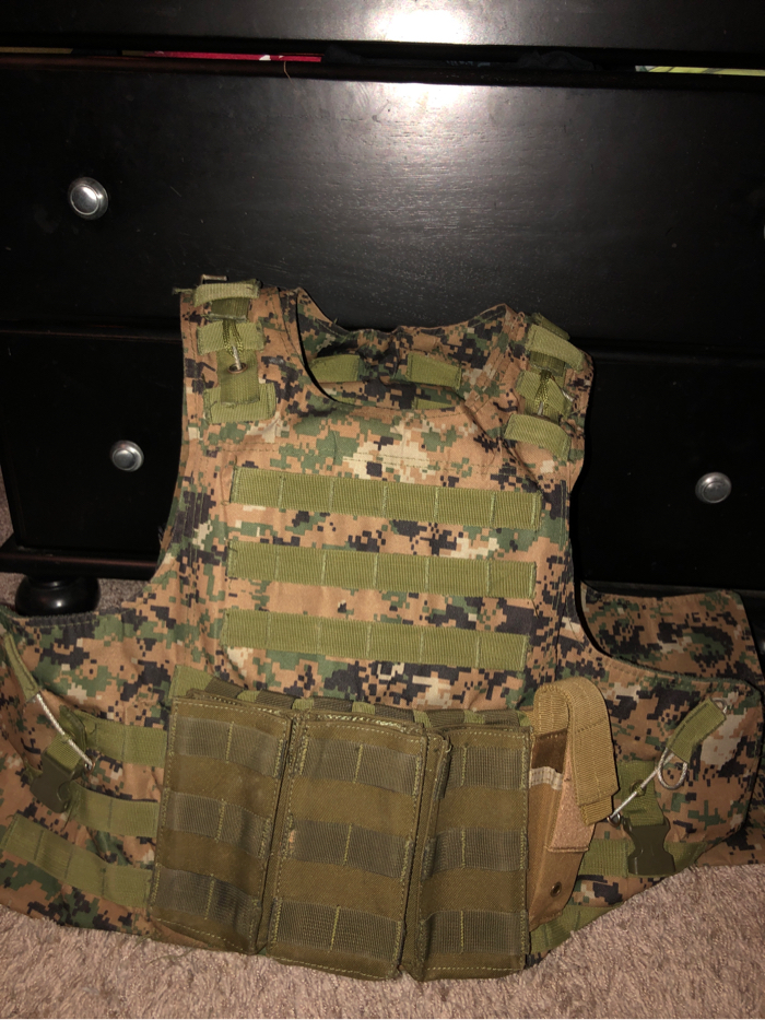 Includes all that’s on it: 3 m4 mag pouches, 1 pistol mag pouch, and molle backpack (All is removable) Fits like adult medium *i was 6ft, 135lbs in that picture*
